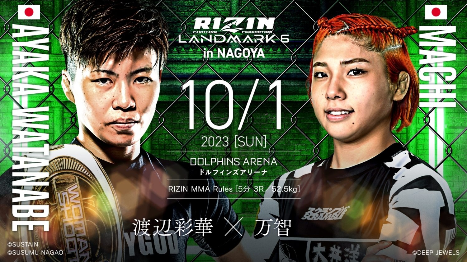 ◆万智「今回、中学生の頃からの夢だったRIZINという大舞台で試合ができることをとても嬉しく思い感謝しております。しかも相手は修斗のチャンピオンです。DEEP JEWELSファイターとして最高の舞台でチャンピオンを倒して一気に駆け上がります!!!憧れの舞台に立てる喜びを更なる飛躍に変えられるようにここは絶対に勝ちます!渡辺選手は打撃の選手なので私も今回は打撃強化で練習してきました。今回はストライカー同士の打ち合いを楽しみにしていてください!」