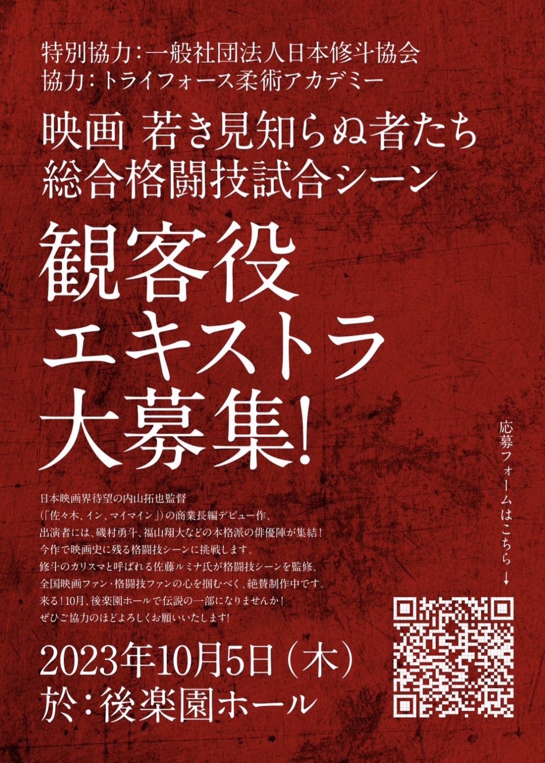 10月5日(木)に後楽園ホールにて行われる映画の撮影に日本修斗協会が協力する。協会のアマチュア委員長・佐藤ルミナ氏が格闘シーンを監修し、日頃のプロ修斗公式戦・後楽園ホール大会の会場をそのまま再現し、ケージ上で格闘シーンの撮影を行う。現在エキストラを応募中だ。以下は制作元からのプレスリリース抜粋。