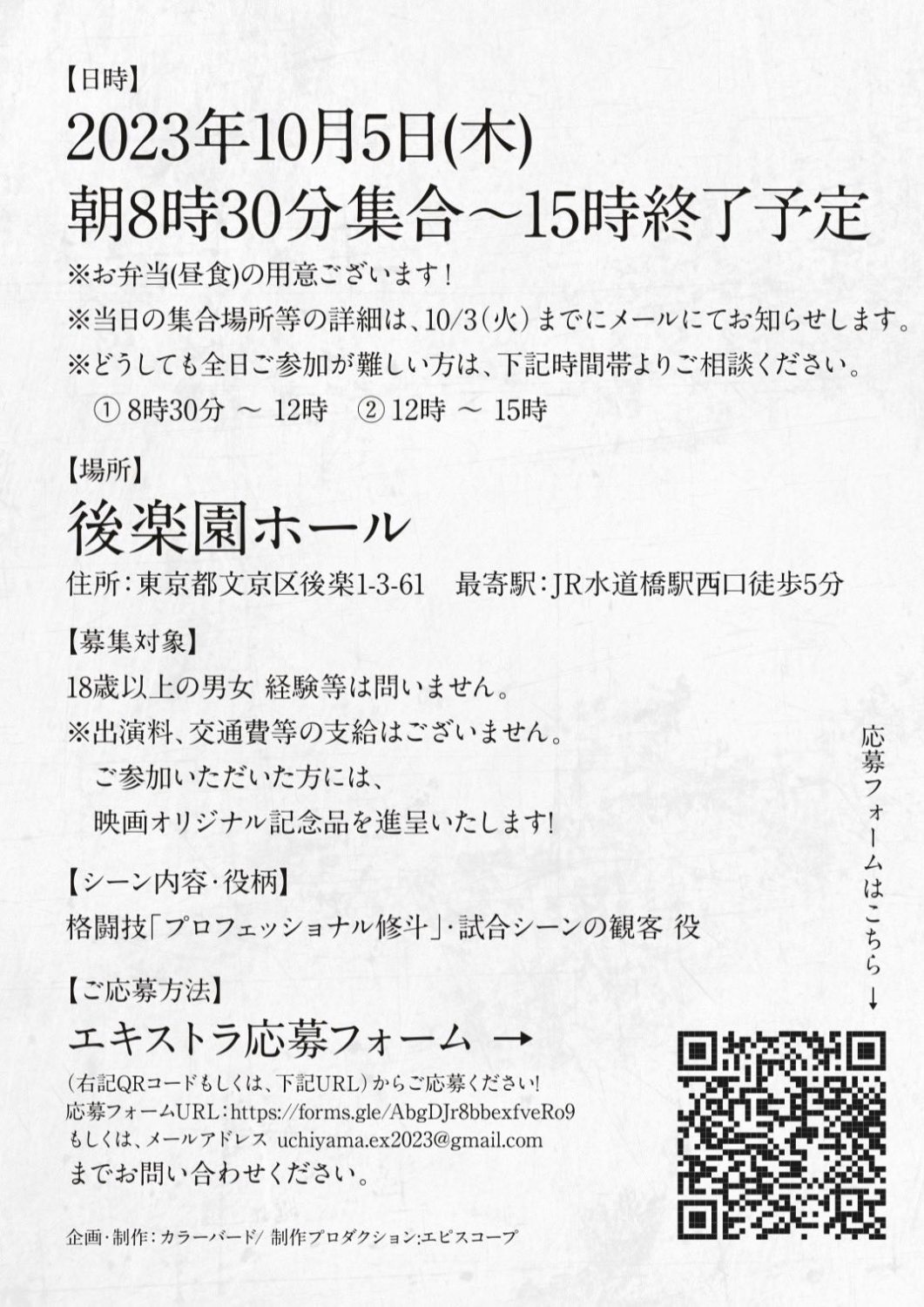 注意:出演料、交通費等の支給はございません。ご参加いただいた方には、映画オリジナル記念品を進呈いたします。