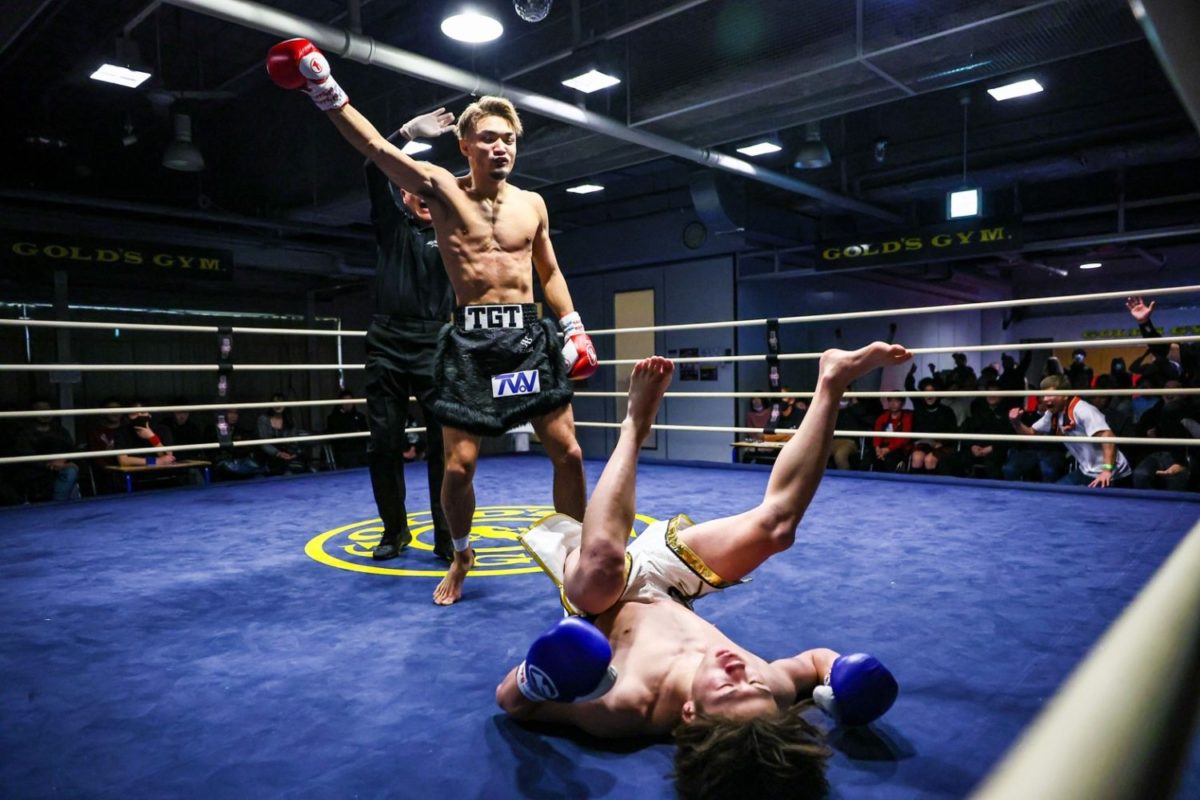 1R、いきなり嵐舞が左ストレートをヒット。だが、TAKUが右ストレートを良いタイミングで当て返して、先制のダウン奪取。TAKUはじりじりと距離を詰めて、狙い澄ました右ストレート。これを見事にヒットさせて、早くも2度目のダウンを奪う。