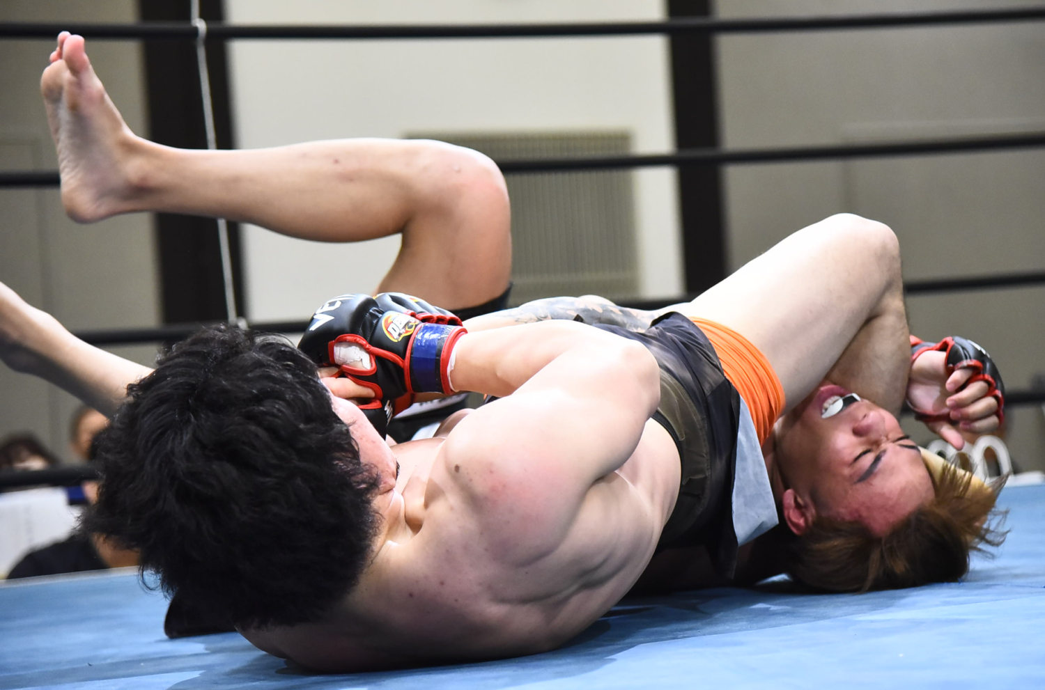 1R、鶴斗のヒザに合わせてタックルを合わせた多湖がテイクダウン。ブレイク後の展開でも多湖がテイクダウン。鶴斗が立つと、多湖はおんぶの状態からスリーパーを仕掛ける。