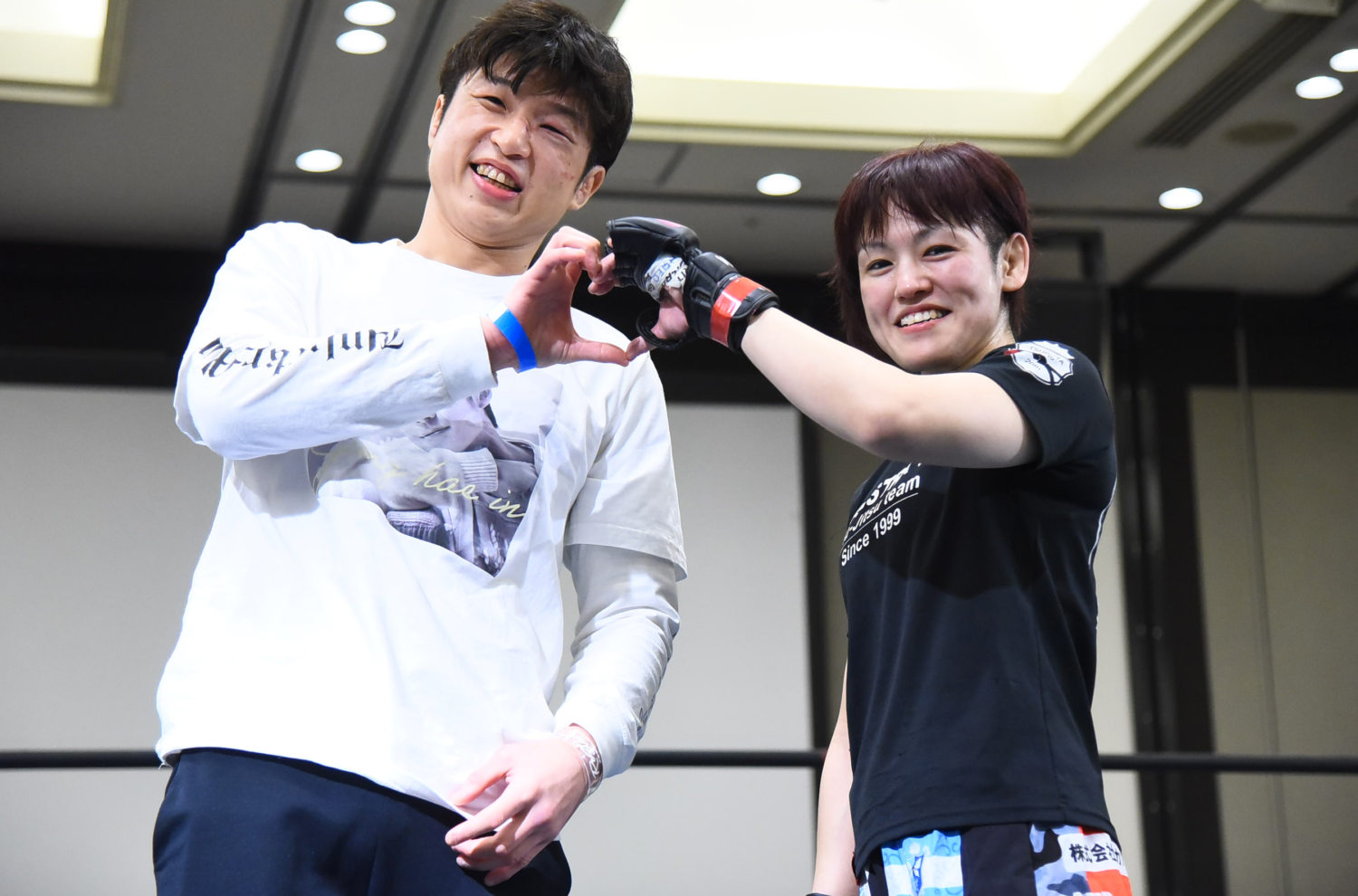 そして、第1部で勝利した小林ゆたか(第5代ライト級&第8代フェザー級キング・オブ・パンクラシスト・ISAOの兄)を呼び込むと、「2人で勝ったら言おうと思っていたんですけど、ウチの旦那さんです(笑)。前に一度、新宿のDEEPで2人で出させてもらいましたが、2人とも負けて何も言わずに帰ったという悲しいことがありました(苦笑)。今日はどうにか2人とも勝つことができて、もう42歳なんで結婚しました」と、小林との結婚報告のサプライズを発表してリングを降りた。