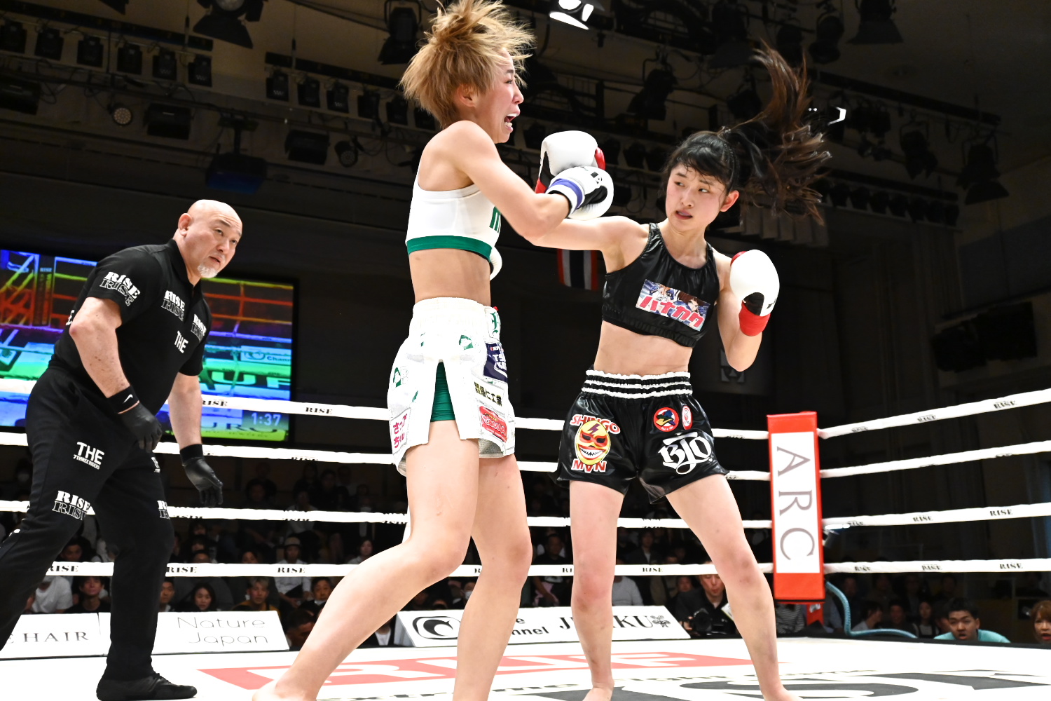 2Rも似た構図で、和花は変わらず左ストレートを当てるが、1Rよりはヒットが減り、終盤には坂田の右インローで少しバランスを崩す場面も。記者採点はイーブン。