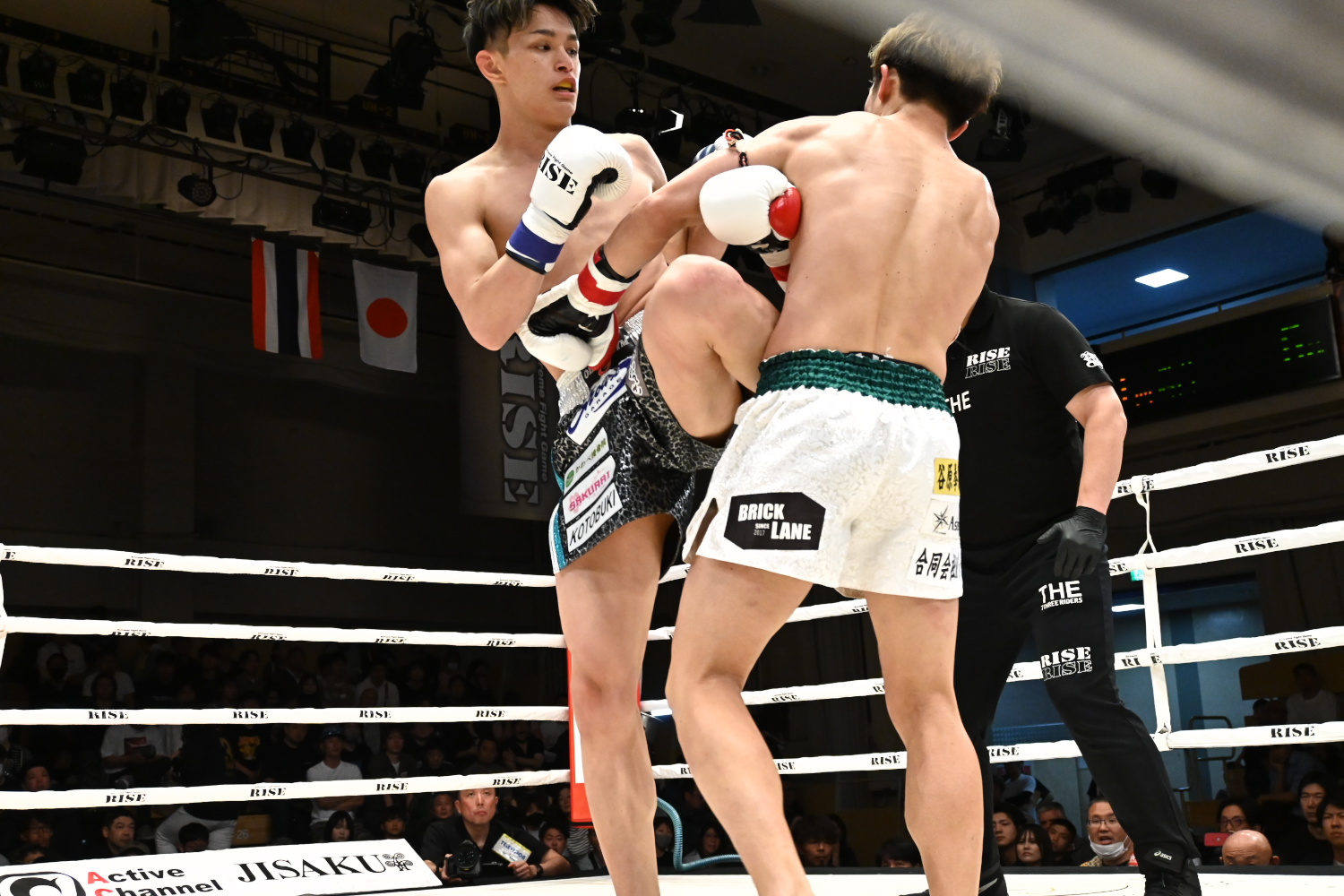 1R、パヌワットが序盤から顔面狙いの左前蹴りを当てて岩郷を吹き飛ばし、さらに右ストレートで倒す。リングアナウンサーはダウンとコールするが、岩郷はロープに手をかけてすぐ立ったせいか、小川レフェリーはダウンと認めない。その後もパヌワットが崩しを絡めつつ、右ストレート、ミドル等を当て続け、岩郷を圧倒する。