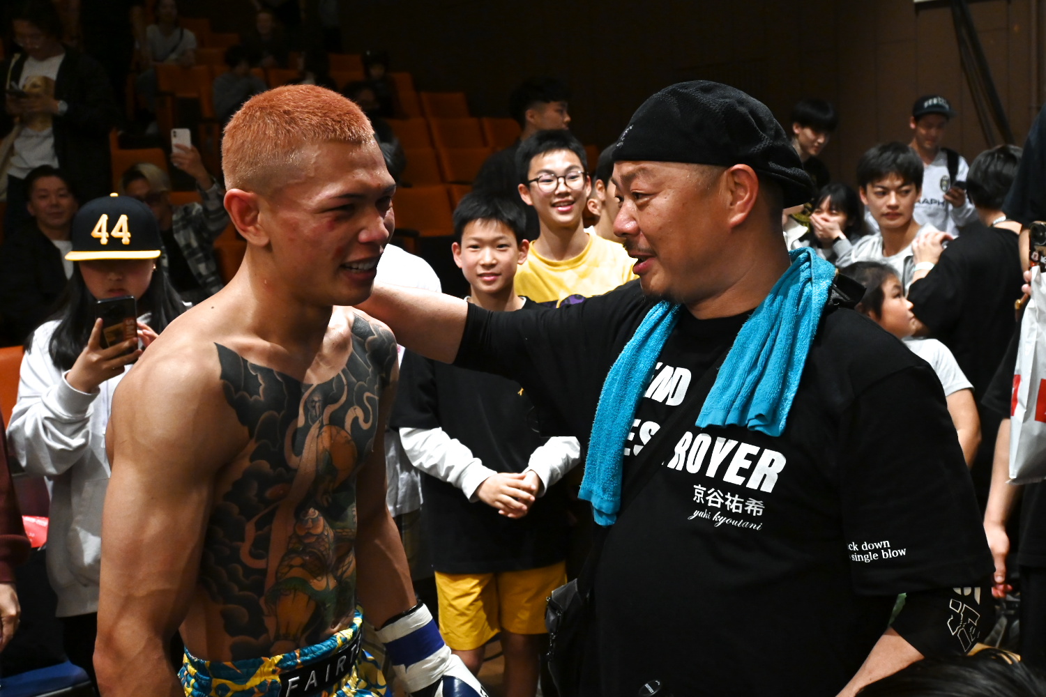 RISEの伊藤代表は「パヌワットはRISEの選手とスパーリングしているので、RISEのルールに適応していました。今年、2人目の子供が生まれたばかりで、お金が懸かった時のタイ人は強いなと思いました」と笑顔で語った。伊藤氏はパヌワットの在籍するTARGETの会長でもあるため、パヌワットの人柄について聞かれると「彼はまじめで、日本に適応しようとしているんですけど、金持っちゃって変わるんじゃないかと心配です。今回も試合のある選手(=宮崎就斗)とミットを持ち合っていました。去年日本に戻って来てから、ずっとRISEに出たいと言ってて、半年ぐらい練習していて、その結果が出たと思います」と説明した。「RISEの外国人エースとして育てたいか」という質問にも伊藤氏は「育てたいですね。面白い」と答え、「6月の大阪大会はカードが決まっているので、9月(8日)の横浜BUNTAIに入れたいですし、海外の強豪ともやらせたいです」と今後の起用について語った。(下写真はパヌワットの練習・指導先のTEPPEN GYMの那須川弘幸会長から祝福を受けている様子)