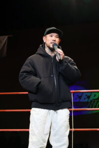 また百花のマイク後には同門であり従兄弟、そして来週12月15日「RISE184」で花岡竜(橋本道場)と第3代RISEスーパーフライ級王座決定戦を競う政所仁(魁塾)がリングイン、マイクを握ると王座挑戦への熱意を語った。