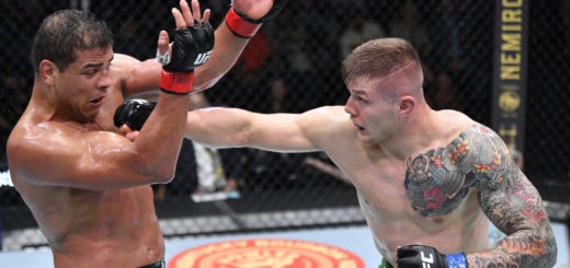 1R、サンドヘイゲンがオーソドックスをベースとしつつ時折スイッチし、左ジャブや右ロー―を当てる、中盤、フィゲイレードが片足タックルを仕掛けて倒し、バックに回り込むが、サンドヘイゲンは振り落として上になる。フィゲイレードから足をつかんで関節技を狙うが、15センチも長身のサンドヘイゲンは体を起こして潰してパウンドと肘を当てる。終盤も同様の攻防が続き、最後はサンドヘイゲンがパウンドを連打して終える。記者採点はサンドヘイゲン。