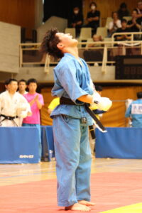 高校1年から3年まで3年連続U19 全日本優勝を遂げ、成人のカテゴリーに昇格するや2018世界選手権出場権獲得、その後2023ヨーロッパ選手権優勝、2023世界選手権準優勝、2024ユーラシアンカップではロシア代表と鎬を削り3位と、国際大会で活躍しながら、全日本では、谷井翔太(2021・24優勝、大道塾横須賀支部)、伊東宗志(2022優勝、大道塾日進支部)、遠藤春翔(2021・22準優勝、大道塾総本部)らトップ選手たちに決勝進出を阻まれ続け、気づけば25歳となっていた曽山遼太(大道塾岸和田支部)。この〝先頭を走り、遅れてきた男〟が遂に初優勝を遂げた。かつては、少年ルール(顔面パンチなし)出身者らしく上段蹴り主体の闘いぶりであったが、今大会では、プロMMAの世界でも試合を重ねる谷井とのレスリングにおいても、ハードパンチャー伊東との中間距離での打ち合いにおいても、真っ向勝負。引き下がるところなく、一方で離れての蹴りで攻勢を印象づけ、どちらの試合もノーポイントながら旗判定を制した。決勝後、試合コートを出る際、安堵からか宙を見上げた姿は、これまでの道程が容易なものではなかったことを覗わせた。