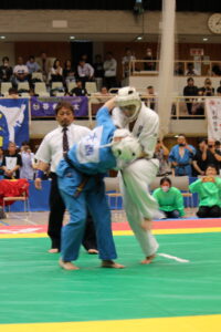 決勝。ニーインベリーでのキメ突きで効果(1ポイント)を奪う小野寺。この後、腕絡みに移行し、タップを奪った