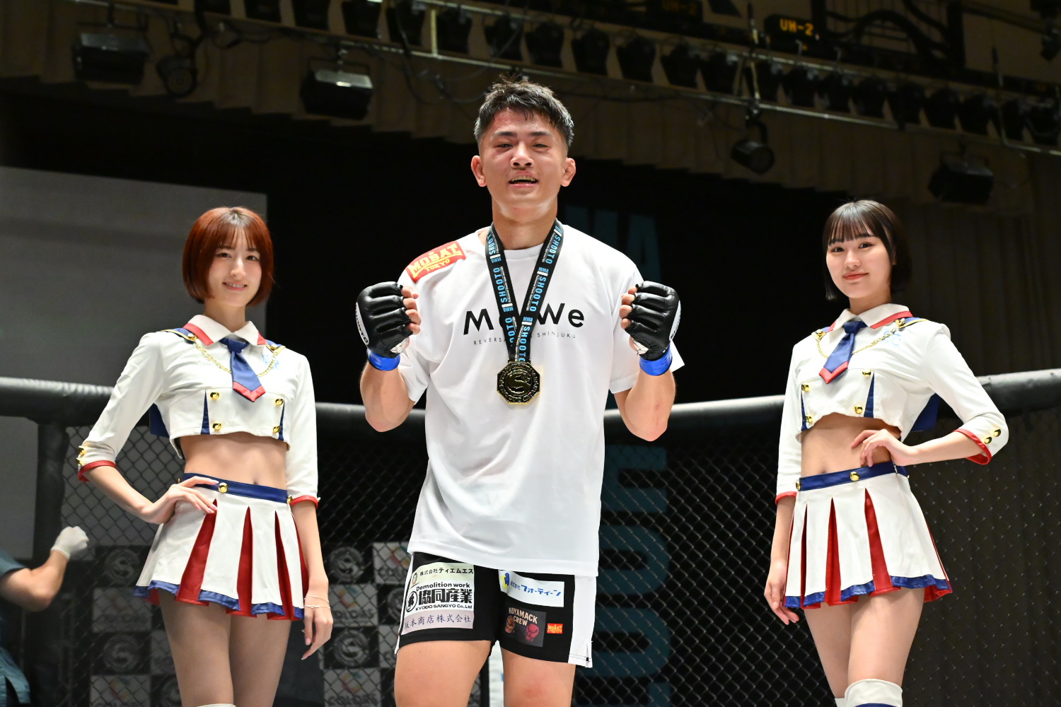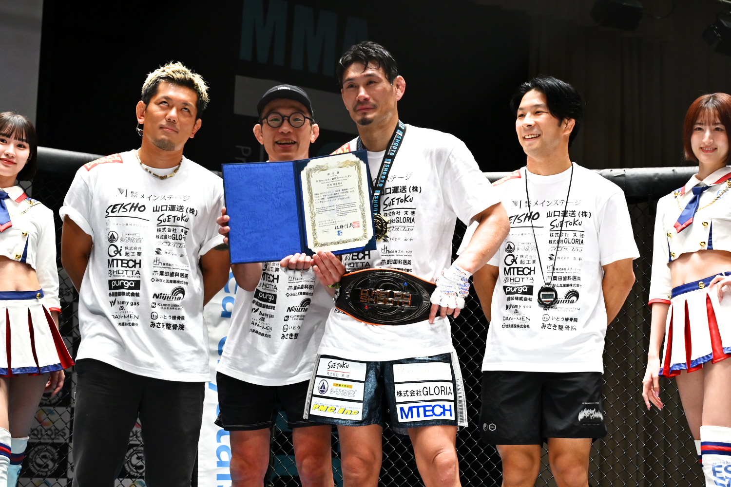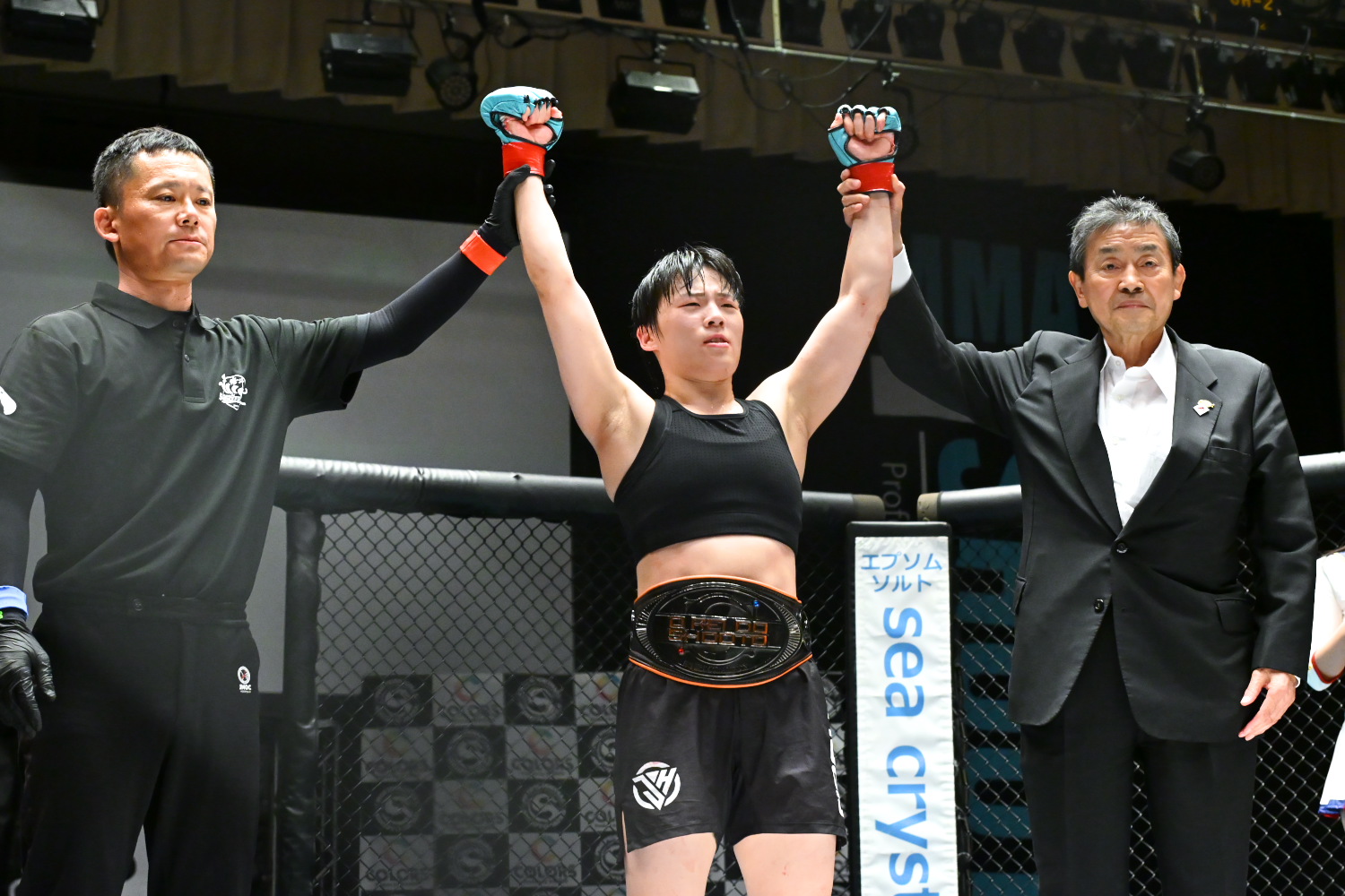 ベルトを巻いた住村は「しょうもない試合してすみません。ソーキ選手、気持ち強かったです。(大会主催のサステインの)坂本(一弘)社長、今年中に正規のチャンピオンとやらせてください」とアピールした。最後はセコンドの皇治、青木真也、松嶋こよみと共に記念撮影した。