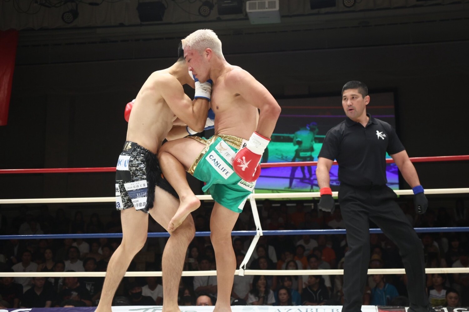 1R、お互い右カーフキックを当て、中盤から大石はスイッチを時折するようになり、カーフを効かされているようにも見えたが、終盤、逆に右カーフのヒットを増やし、インカーフも当てるように。すると残り30秒、大石は空手仕込みの左内回し蹴りを顔面にクリーンヒットしてダウンを奪う。最後、詰めて来る齋藤に対し、大石は右フックを当てて終える。