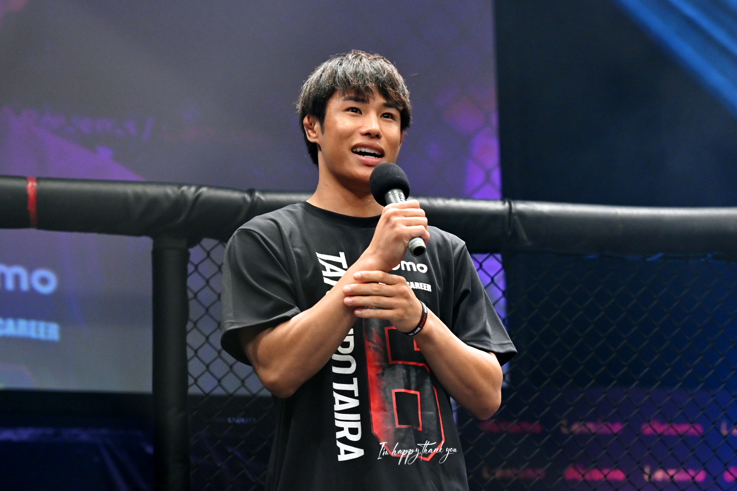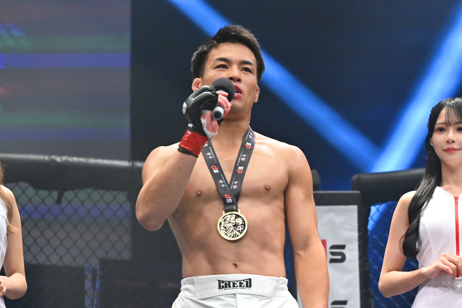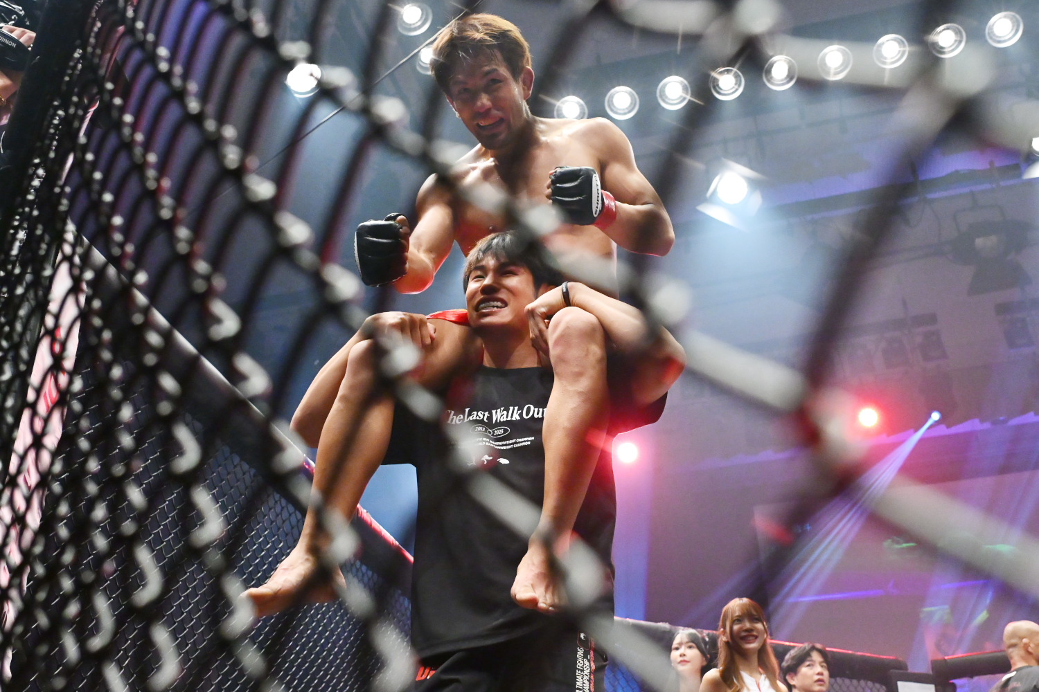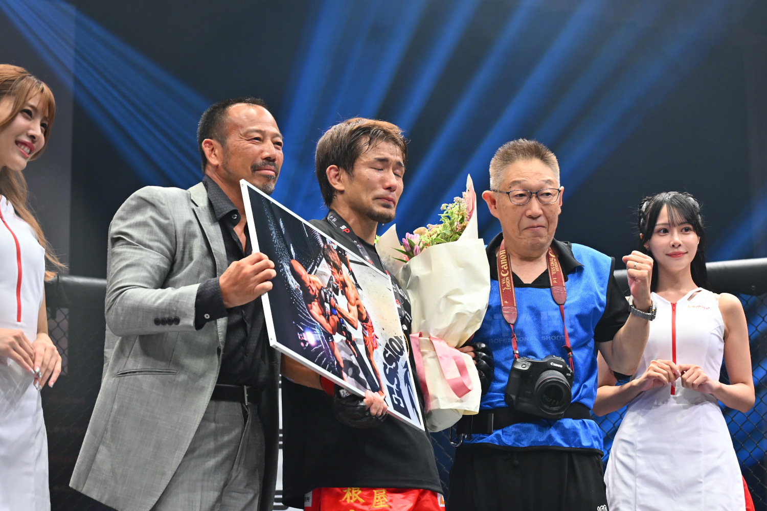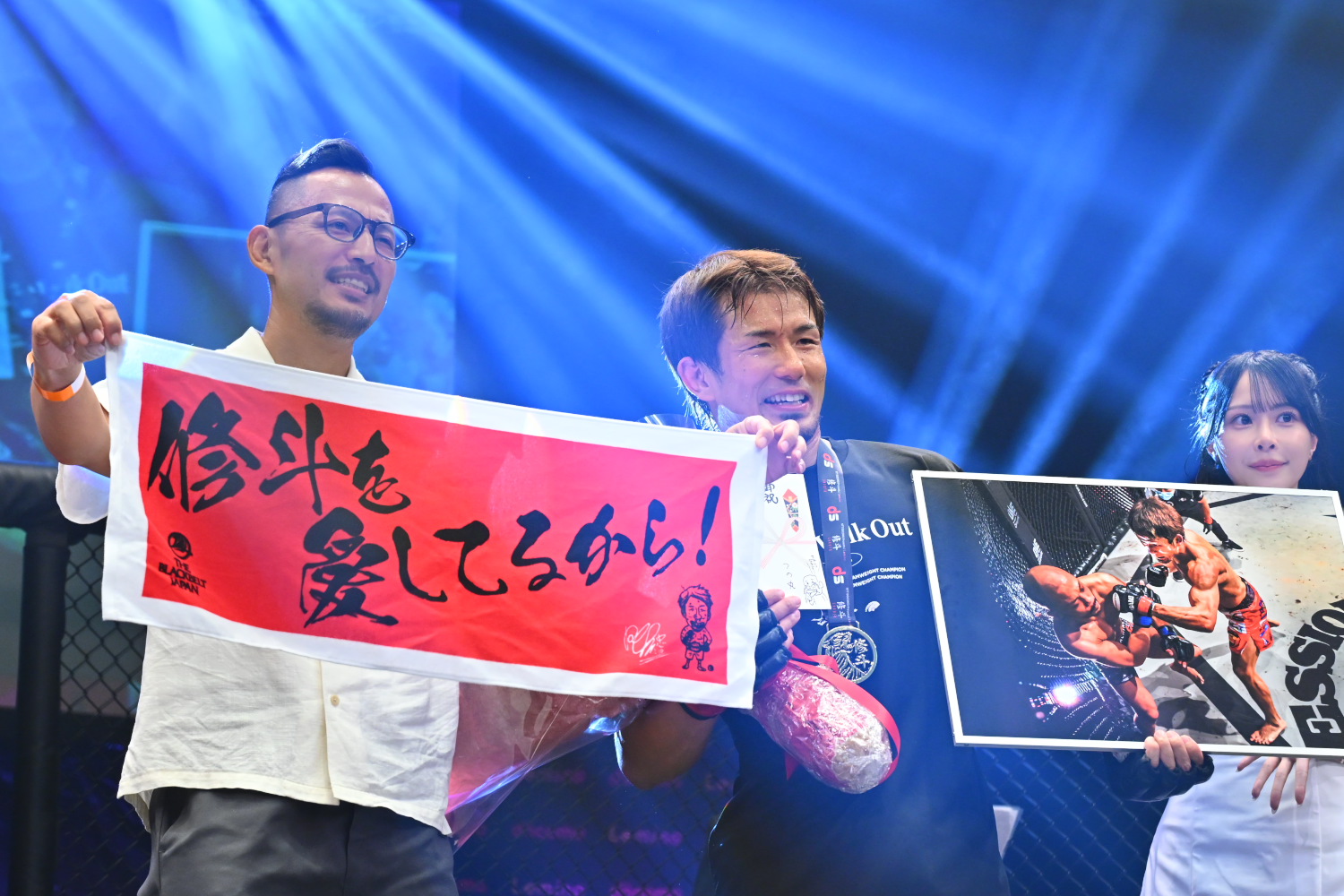 とても幸せです。こんな幸せな格闘技人生無いです。ありがとうございます。(引退試合でいい勝ち方ができたのが大きい?)そうですね。10回やったら9回負けると思ってて、その1回を最後の最後で引き当てたって感じです。本当に強いチャンピオンですし、階級も(弥益が本来1つ上で)違うので、分が悪いと思っていました。