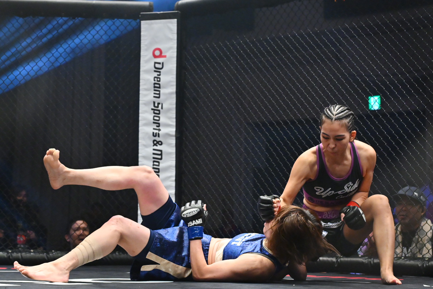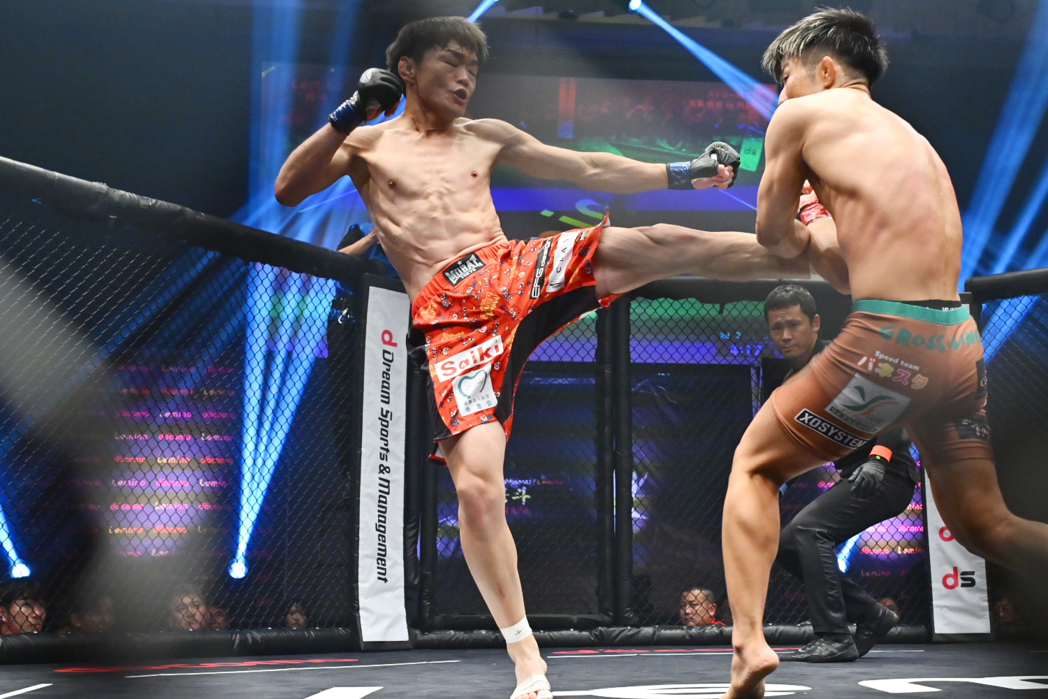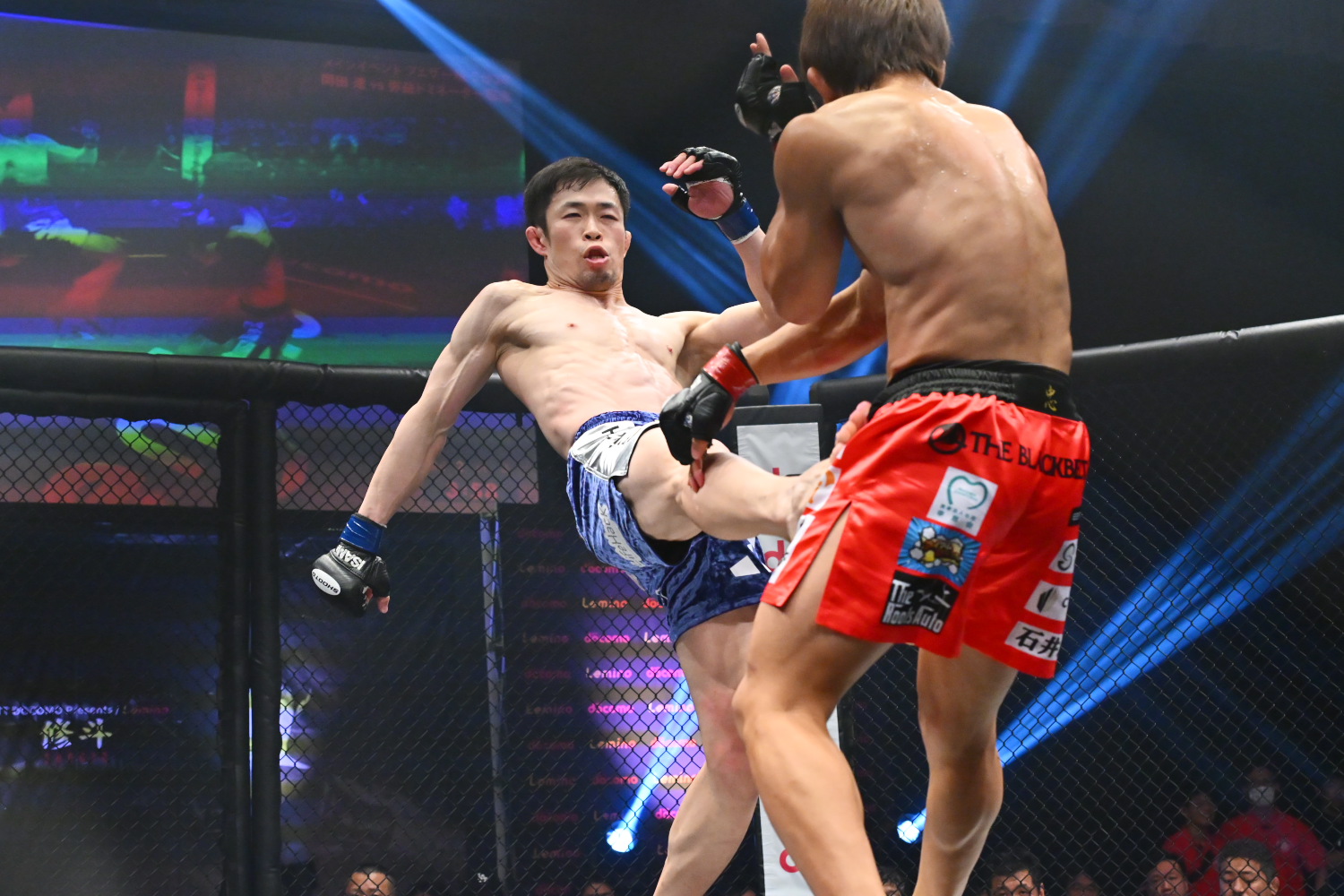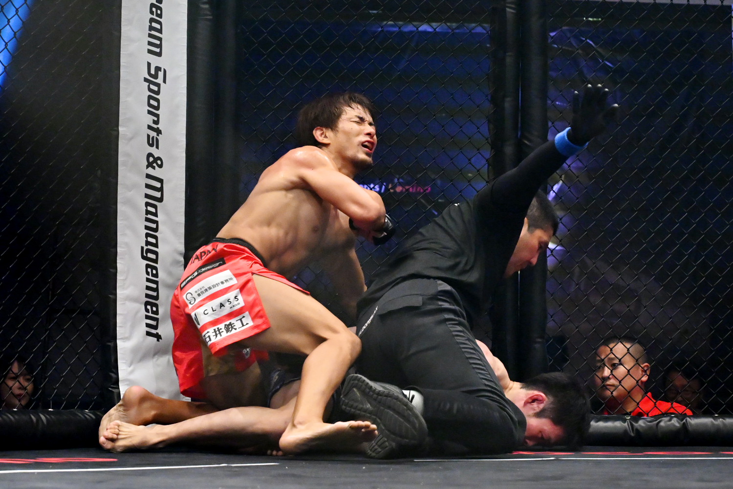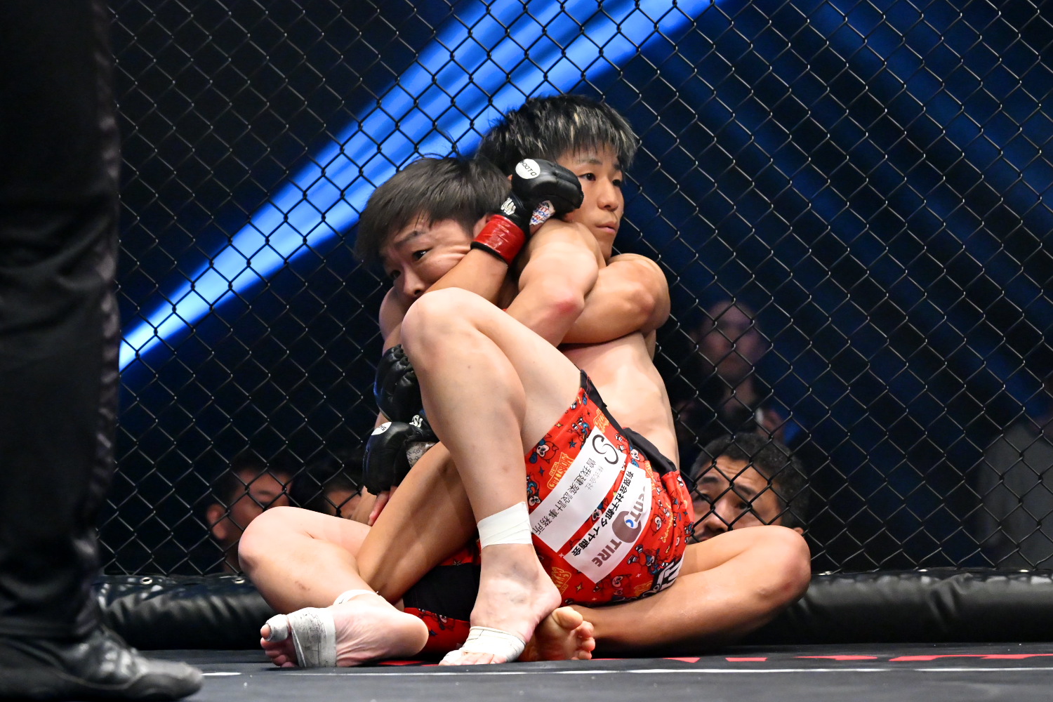 ※2Rグラウンド状態での頭部への膝蹴りの反則により翔べ!に減点1