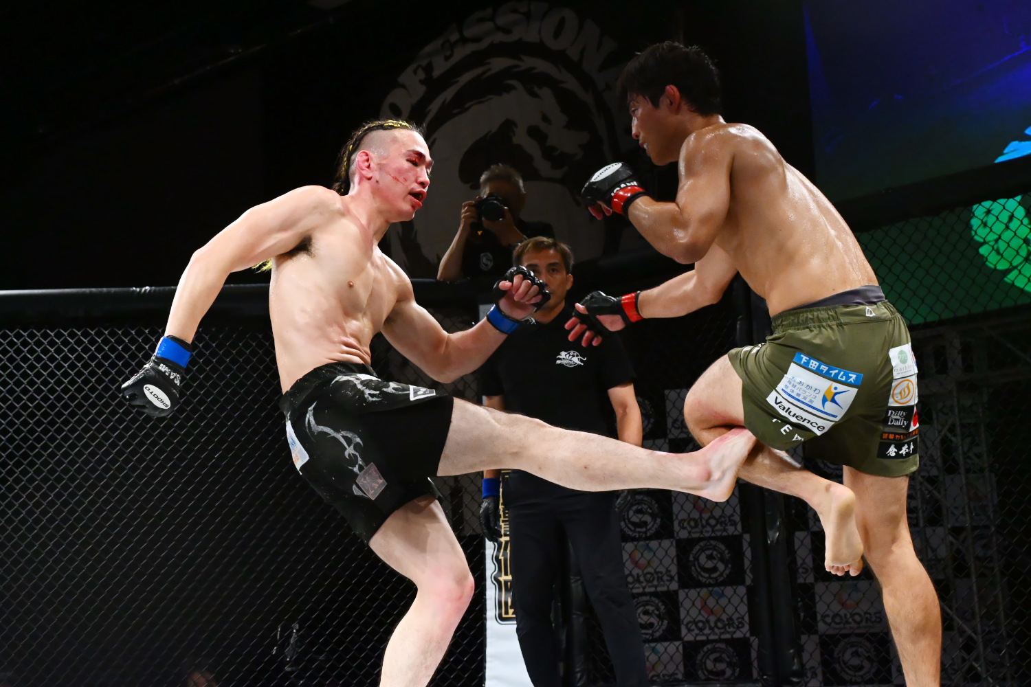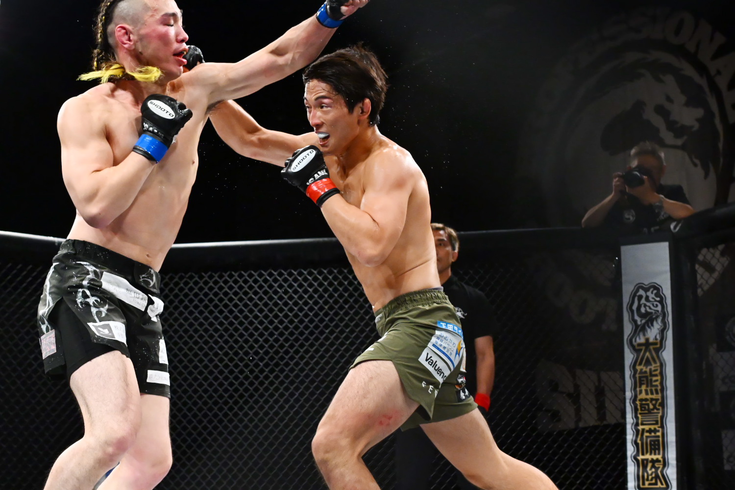 1R、たておの右のパンチのタイミングで、上原は右フック、ボディ、ローを的確に当てる。中盤、たておの右ローをすくって、上原が倒して上になるが、たておは立つ。その後も上原がテイクダウントライ、右ハイ、パンチで主導権を維持する。記者採点は上原。