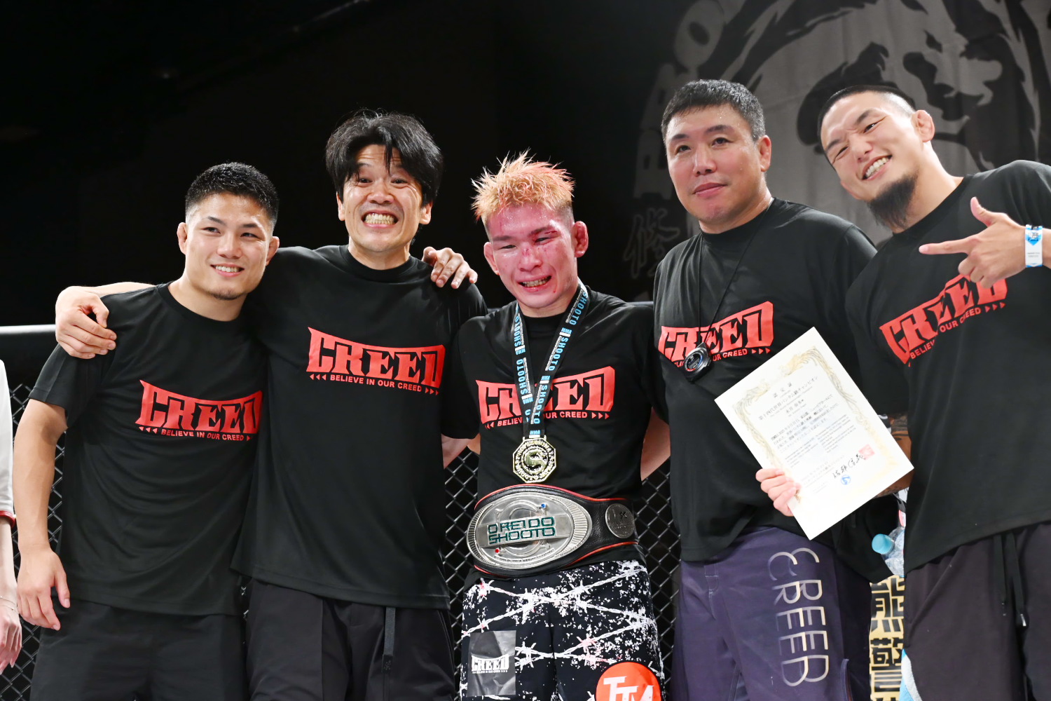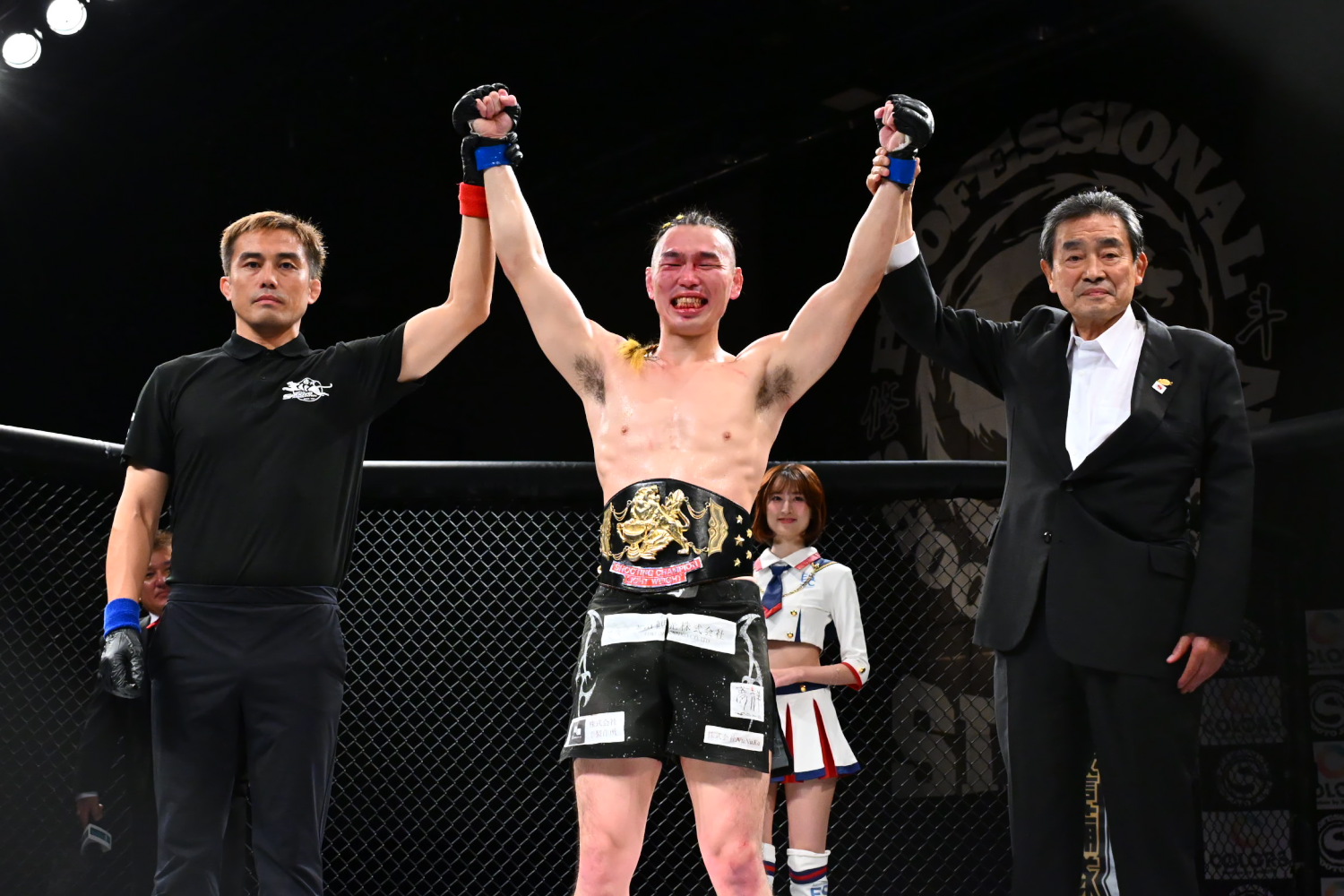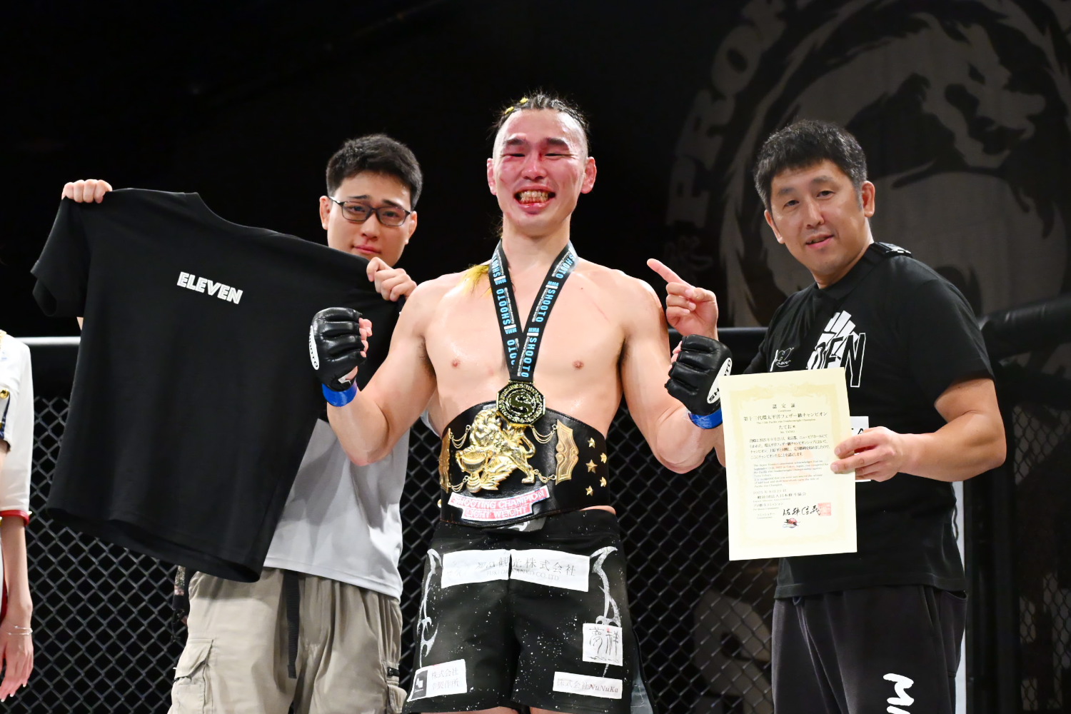 第3代環太平洋フェザー級王者となったたておは涙を流して喜んだ。たておは「修斗歴代ナンバーワンのロンゲイケメンのたておです」とジョークを口にしつつも「タイトル取ったら泣かないんだろうなと思ったら、格闘技やってた14・5年の思いがあふれて、涙が出てしまいました」と明かし「まだ2-1の判定で、なんとも言えないチャンピオンなんで ベルトの価値を上げられるよう頑張ります」とアピールした。