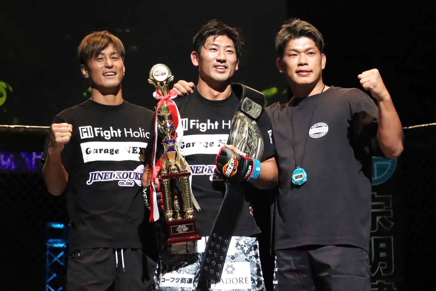 続けて嶋田は「ベルトを獲ったからといって終わりではないので、ウェルター級まだ強い人が残っていると思いますけれどね、ストラッサーさん、今日いらっしゃいますか?」と呼びかけ、中継の解説を務めたストラッサー起一がケージに登場した。パンクラス、HEAT、UFC、RIZIN等で試合を重ねて来た44歳のベテラン・起一は1週間前のDEEP後楽園大会でDEEPに初参戦し、元DEEPウェルター級王者の佐藤洋一郎に判定勝ちし、王座挑戦に名乗りを上げていた。起一は角野の練習仲間でもある。