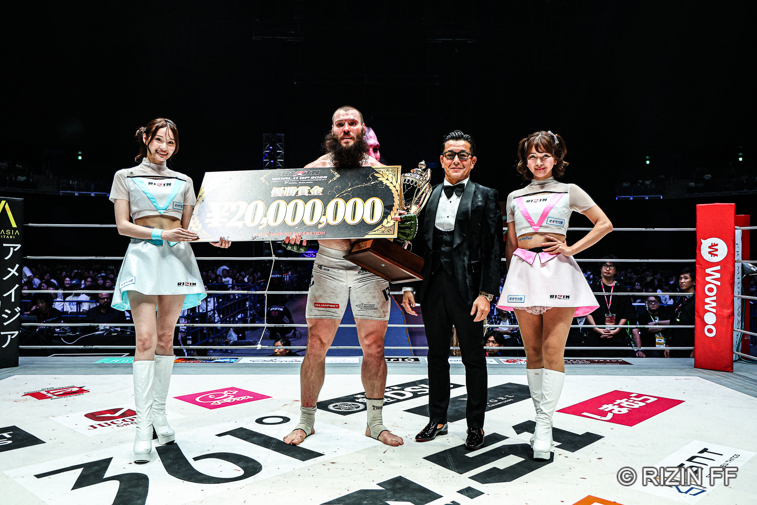 優勝のソルダトキンは賞金2千万円のプレートを受け取り、榊原信行RIZIN CEO、セコンド、一人でソルダトキンを育てた母親に感謝の言葉を述べた。