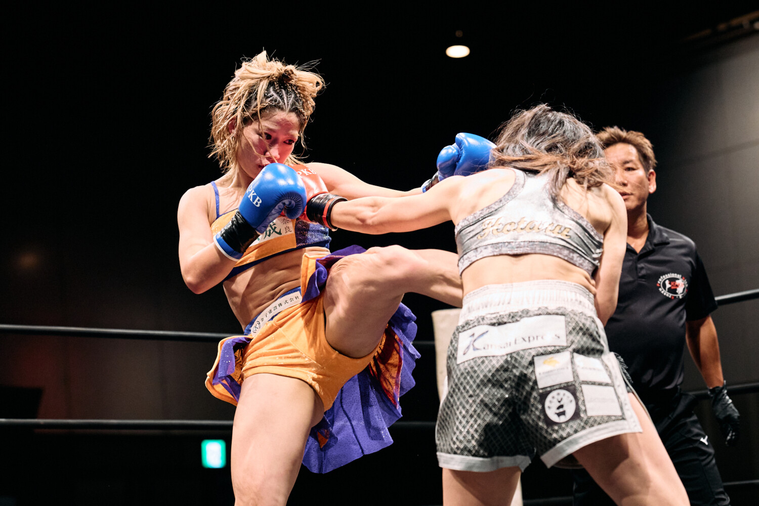 KPKB女子バンタム級タイトルマッチはKNOCK OUTからやってきた鈴木万李弥が王者Hotaruに挑戦。前回鈴木に負けているHotaruは、初回から気合いと決意を感じるファイトを見せる。鈴木もそれに応えるかのように1Rから激しい殴り合いに。譲らない展開は3Rまで続き、鈴木が判定勝利。初めてのベルト獲得となった。