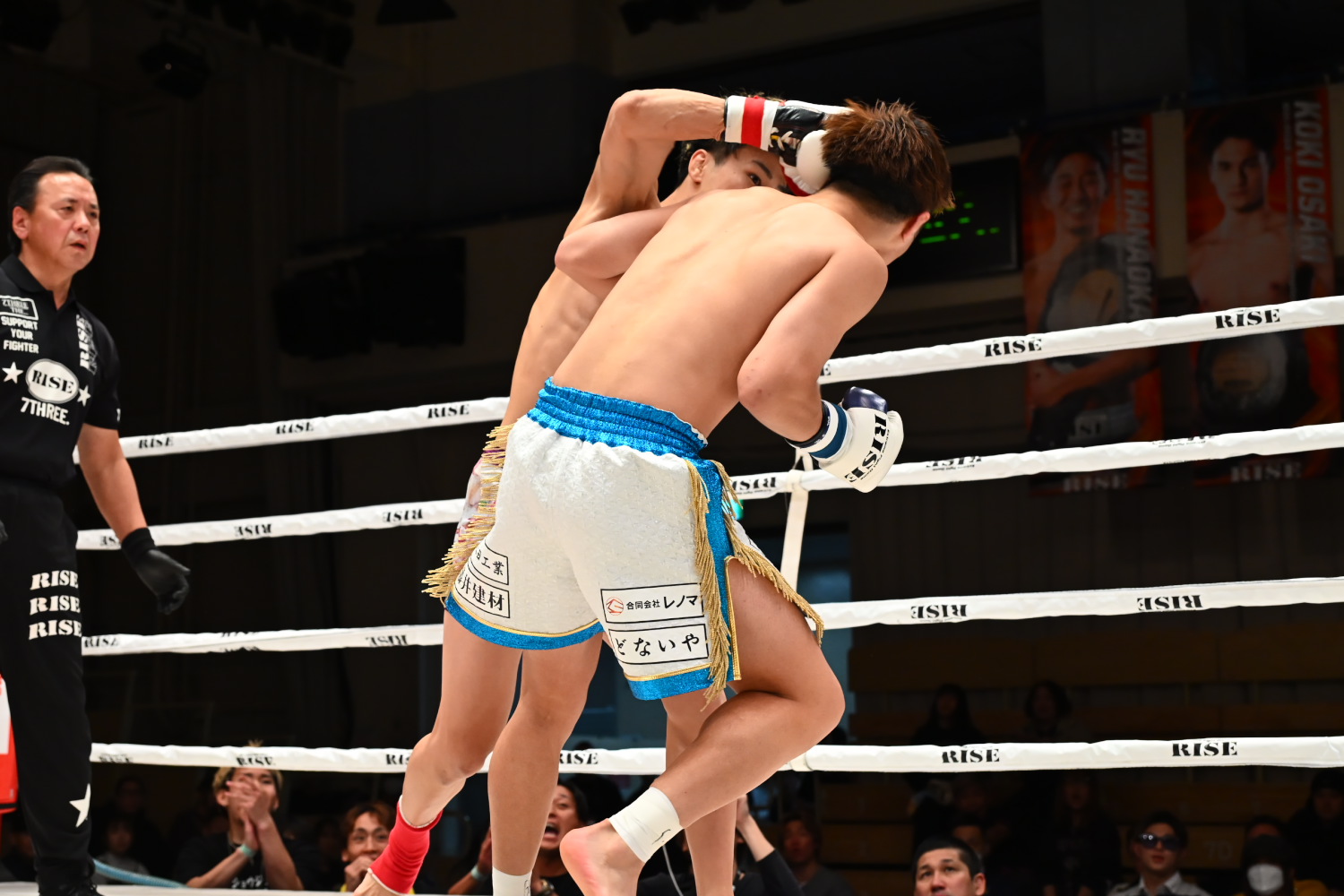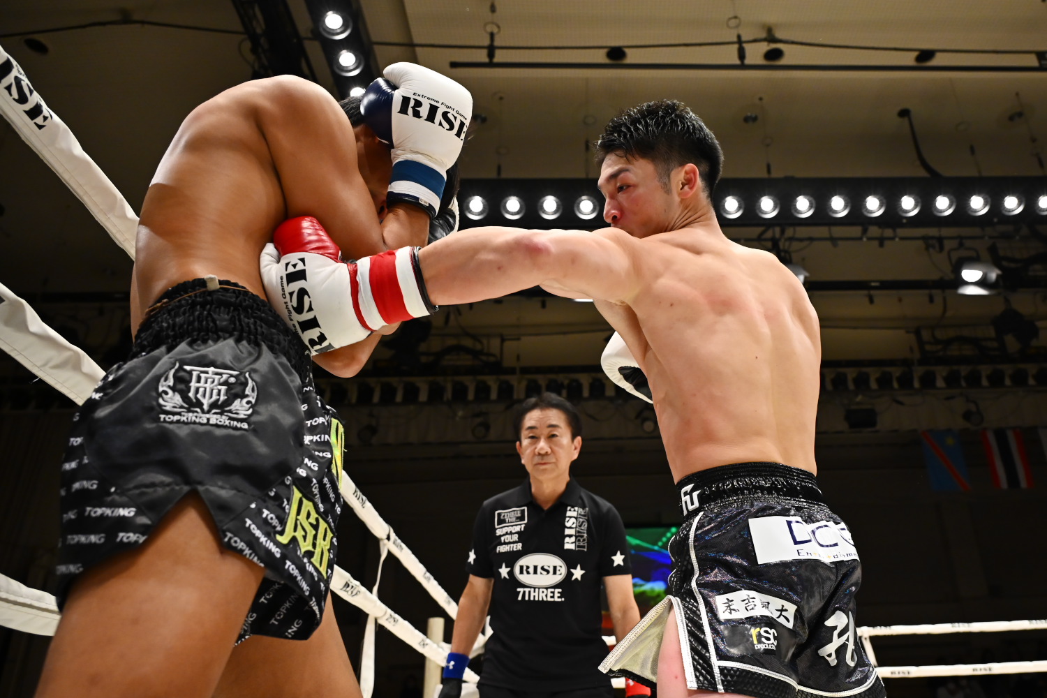 3R、宙樹は右ストレート、テンカオ、ローを効かせるが、首相撲で膝を連打する反則を犯してしまい、豊永レフェリーから警告を受ける。とはいえ流れは変わらず、宙樹が右ミドル、ローを効かせつつ、ストレートでもふらつかせる。終盤、裕人は前に出てパンチを振るうが、宙樹は防御しつつ、右ストレートでダウンを奪う。その後も宙樹が攻め続け終了。8-10で宙樹が取る。記者採点合計27-30で宙樹。点差を広げ宙樹が判定勝ちした。