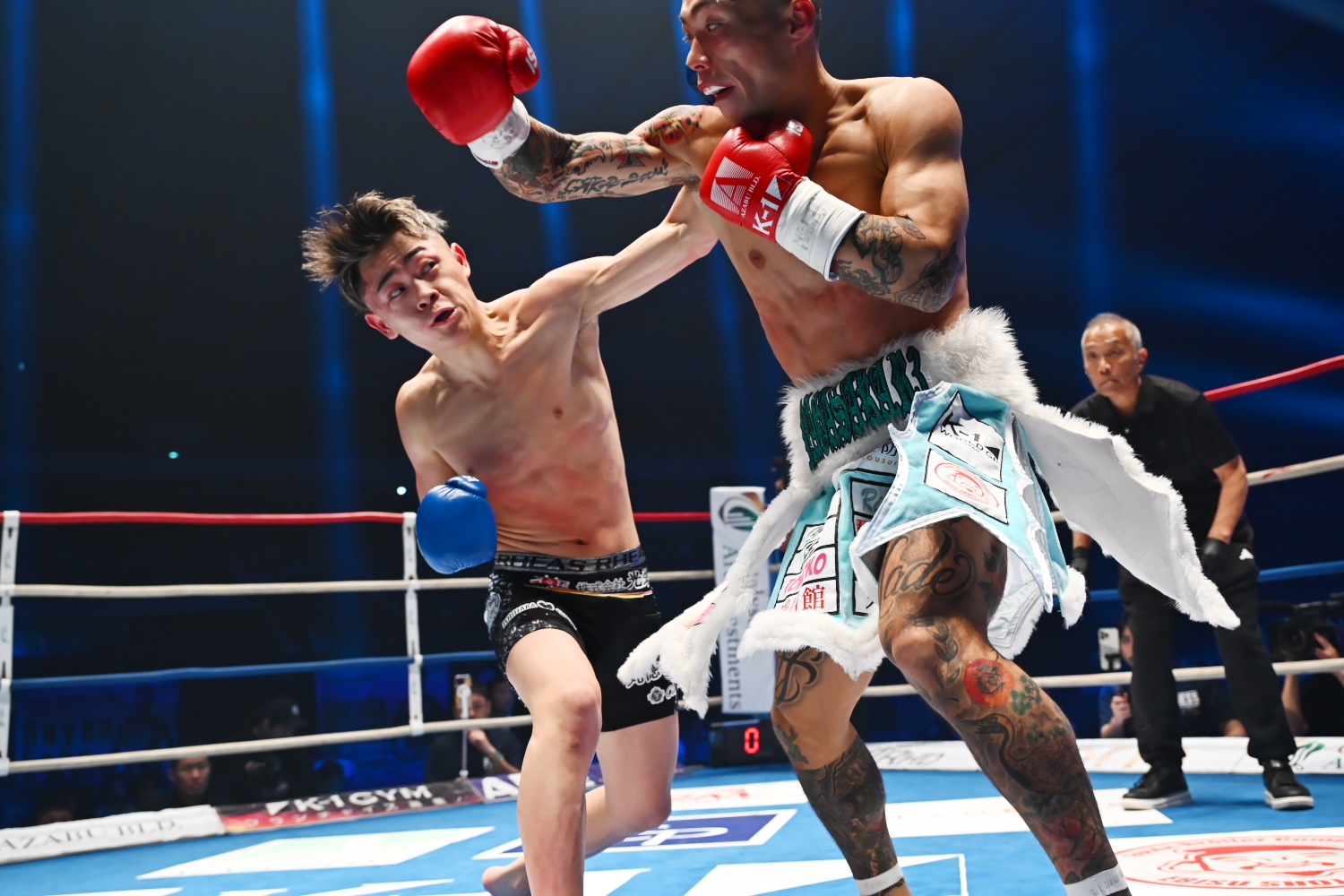 1R、開始すぐから大久保が前に出て、パンチと蹴りを当てて先手を取ると、中盤、左の三日月蹴りを2連続でクリーンヒットしダウンを奪う。ユートンは立つがダメージが大きく、大久保が再び左三日月蹴りでダウンを奪ったところで、豊永レフェリーがストップした。