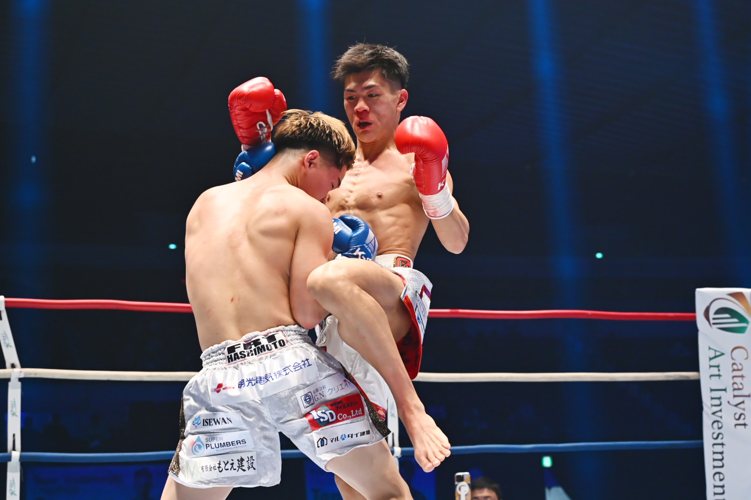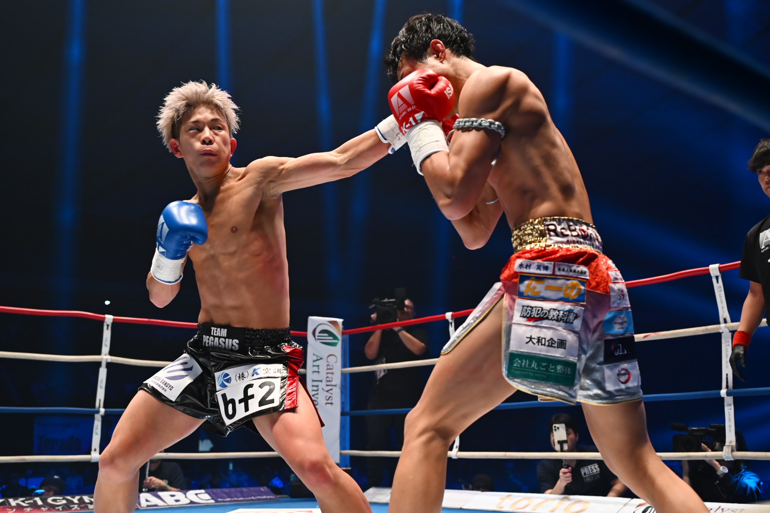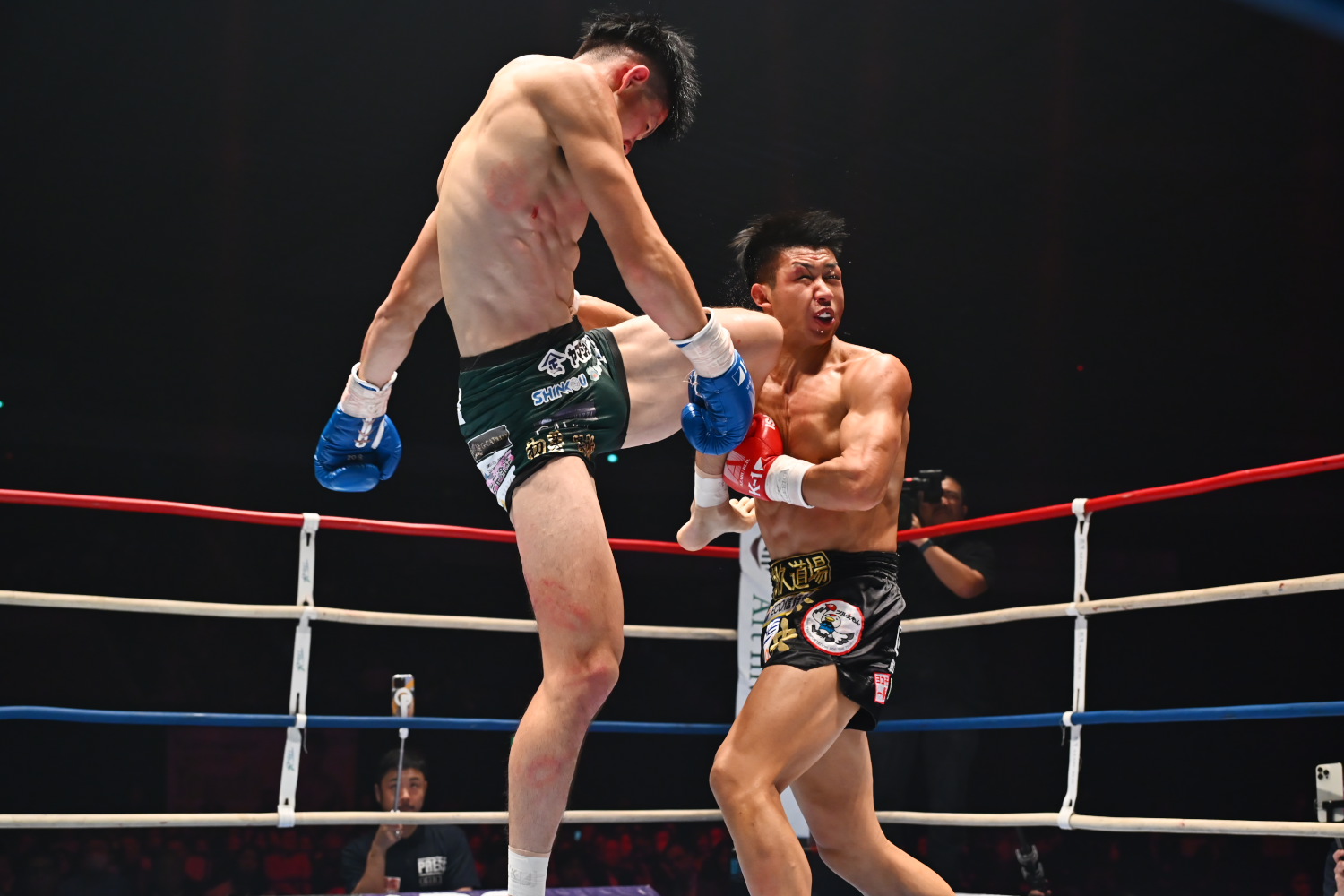 1R、サウスポーの稲垣に対し、泰央は目まぐるしく構えをスイッチしつつ、左ローを度々ヒットし、左右のストレートにもつなげ、手数で差を広げる。稲垣はまだひるまないものの、攻撃が少ない。記者採点は泰央だがまだイーブンもありうる。