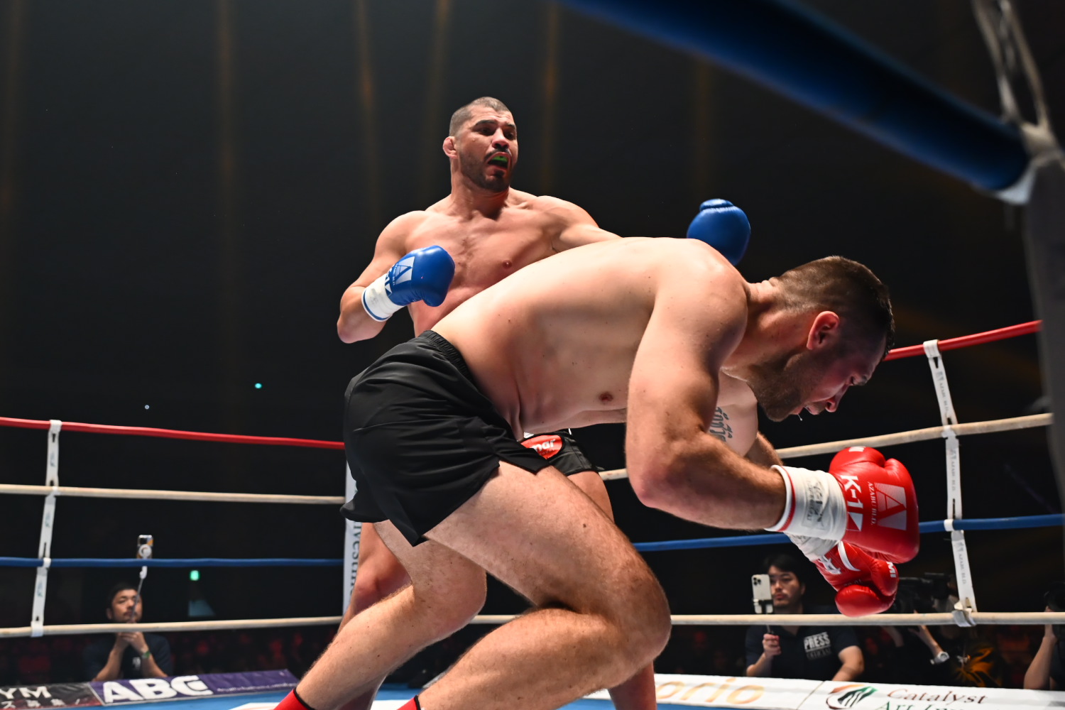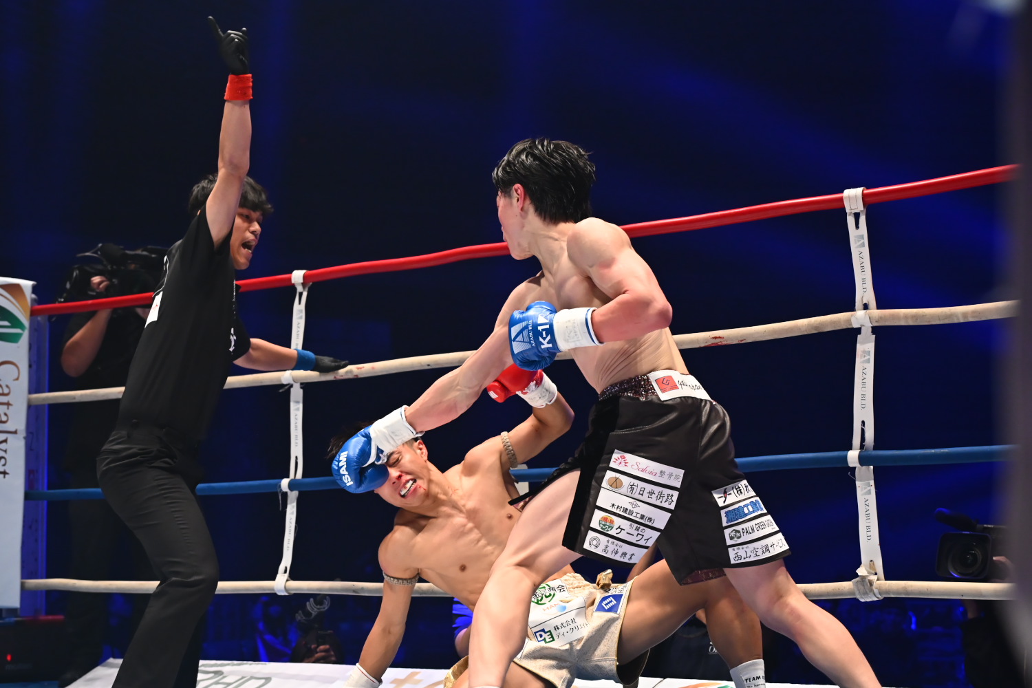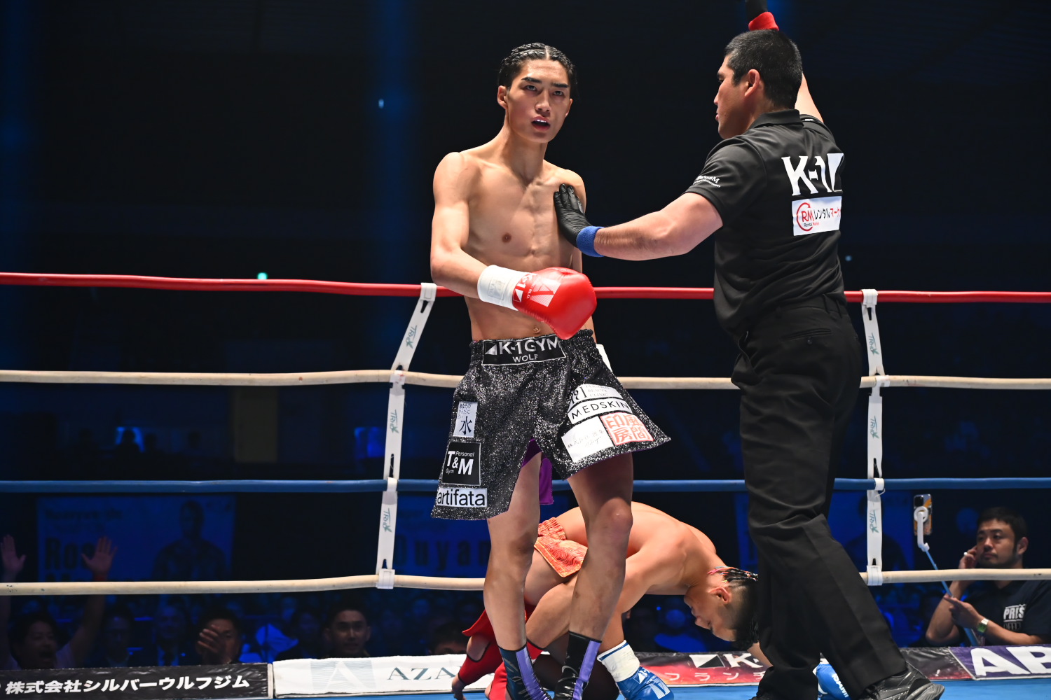 2R、黒川の左ストレートが当たり出し、左ハイでもひるませると、中盤過ぎ、パンチラッシュで左ストレートを立て続けに当ててダウンを奪う。
