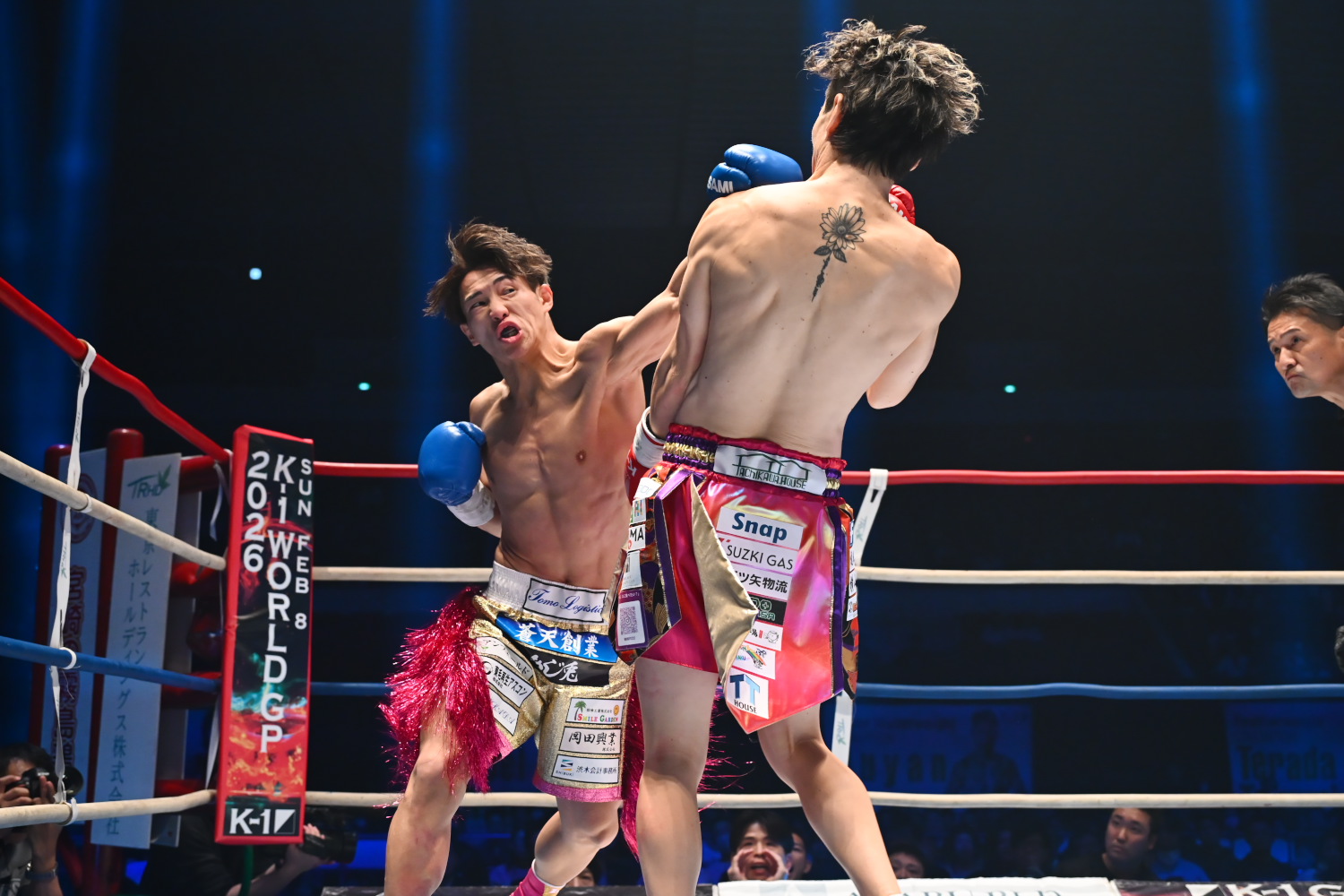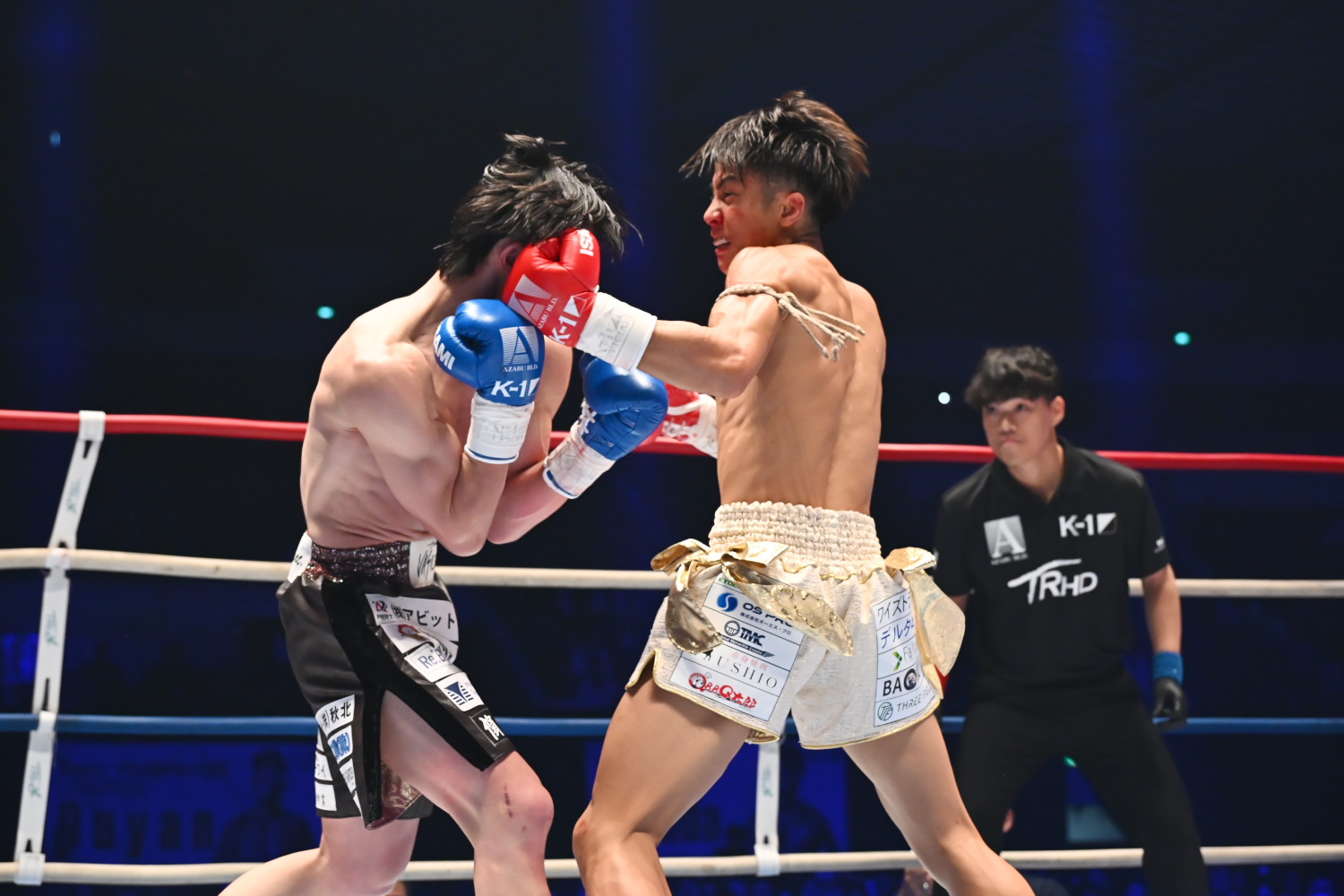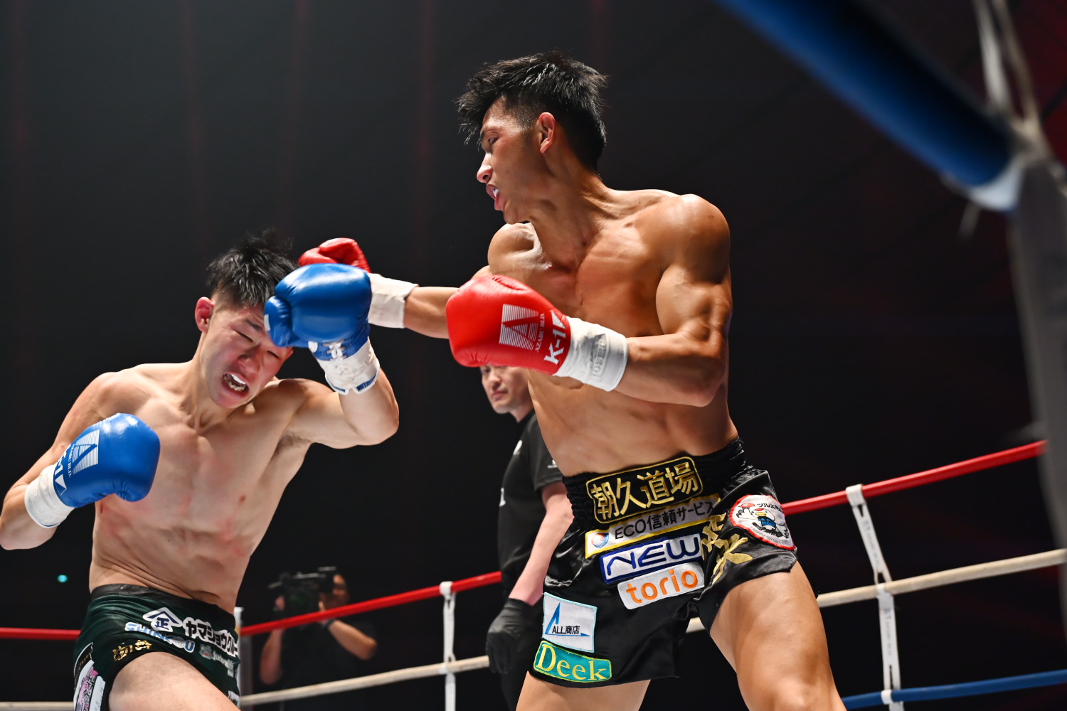 1R、永坂はスイッチ、松本はサウスポーで、お互いミドル、ストレートを当て、五分の展開が続く。だが終盤、永坂がノーガードで挑発すると、松本が左ストレートを当ててダウンを奪う。