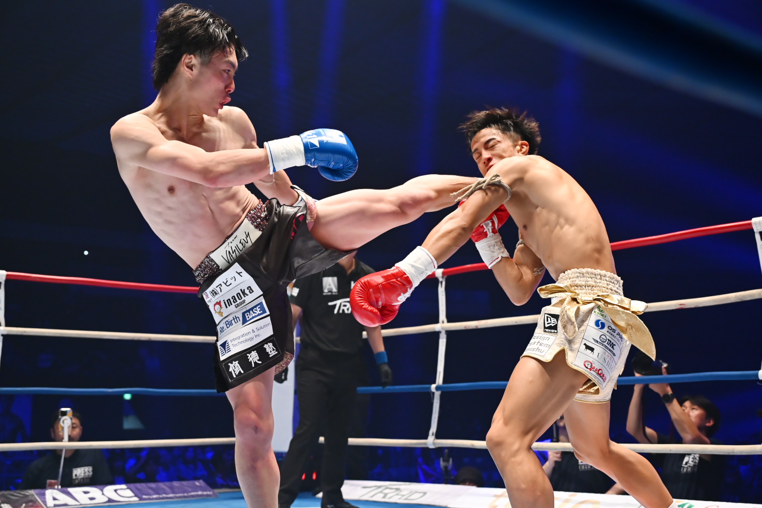 2R、両者の距離が縮まり、ホールディングが増える。その中で稲垣は右アッパー、左フックのヒットが増える。とはいえ泰央は1R同様、スイッチを繰り返しつつ、左右のフックを度々当て、手数では若干上の状態をキープし、流れを変えさせない。記者採点はイーブンだが泰央につく可能性もある。