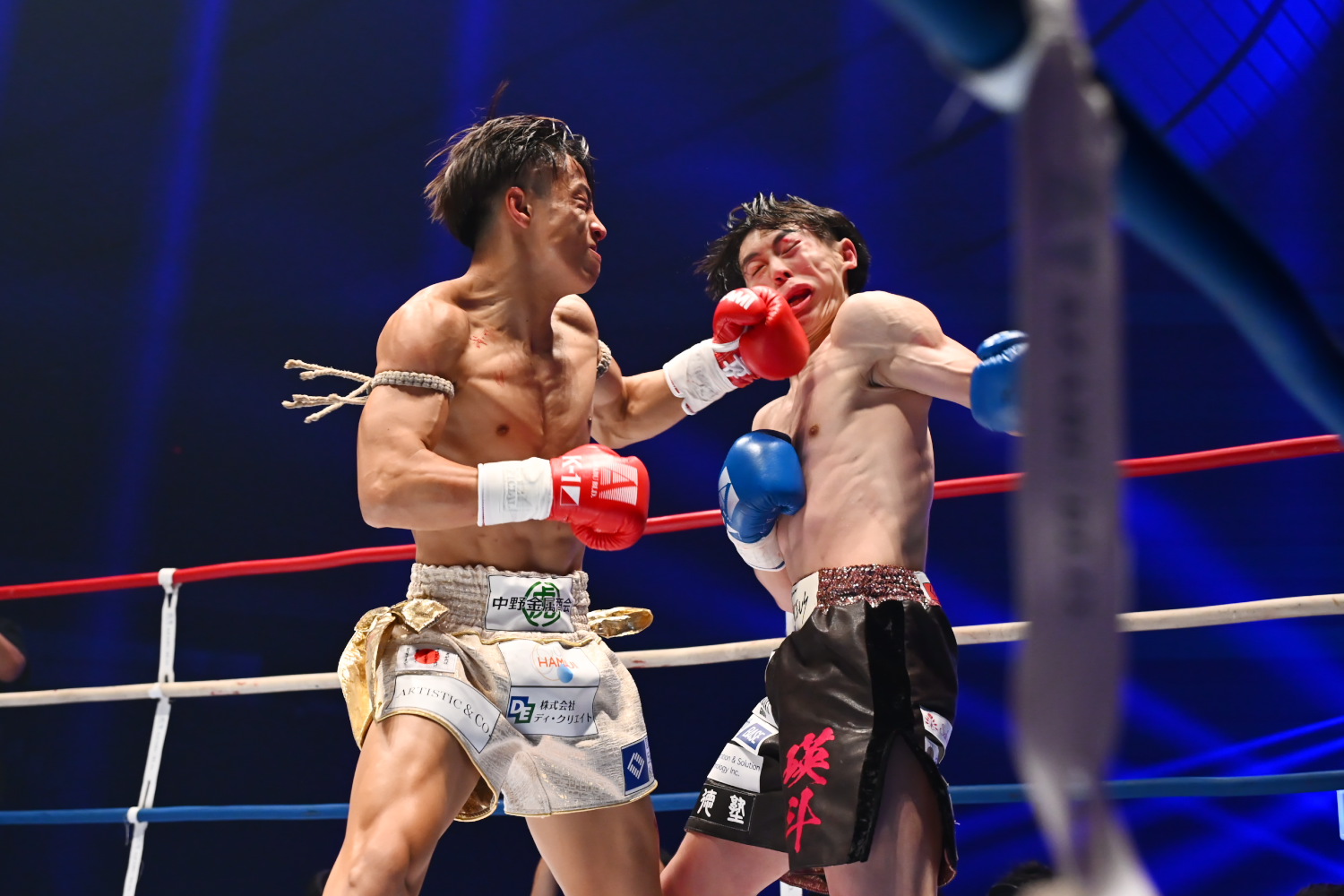 1R、両者サウスポーで構え、パンチ主体で攻め、橋本の手数が少し多いが、まだお互いひるまず、差は乏しい。記者採点はイーブン。