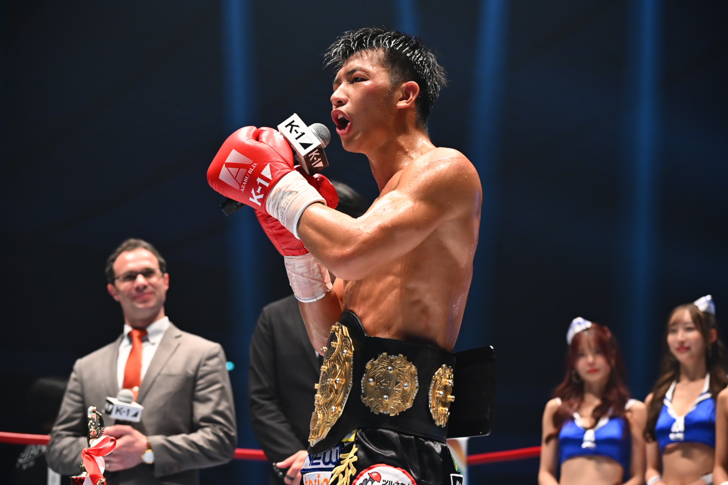 マイクを持った大久保は「スーパー・バンタム級の挑戦者、僕しかないでしょ。僕が昔のような盛り上がっているK-1にしたいです。K-1最高」とアピールした。