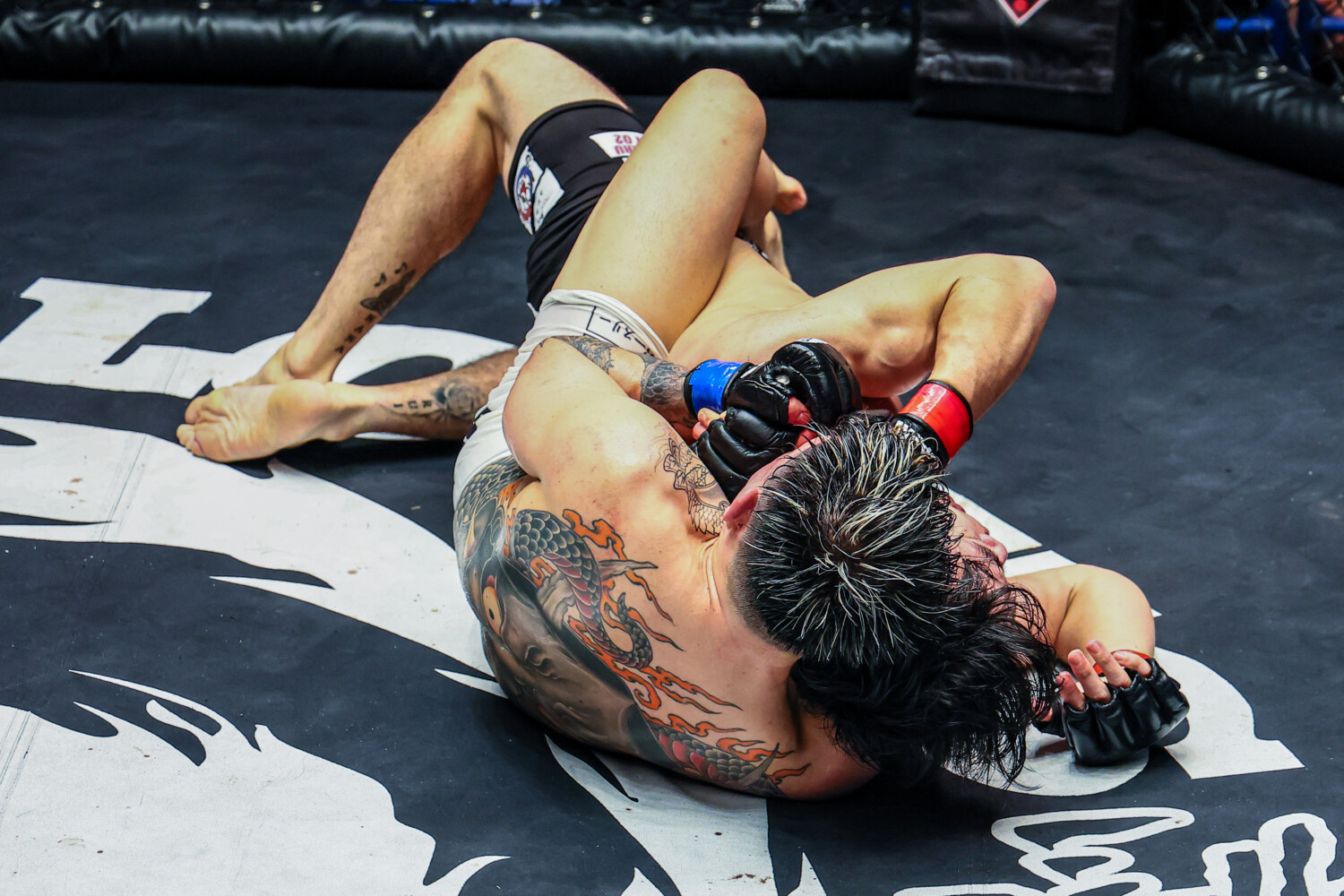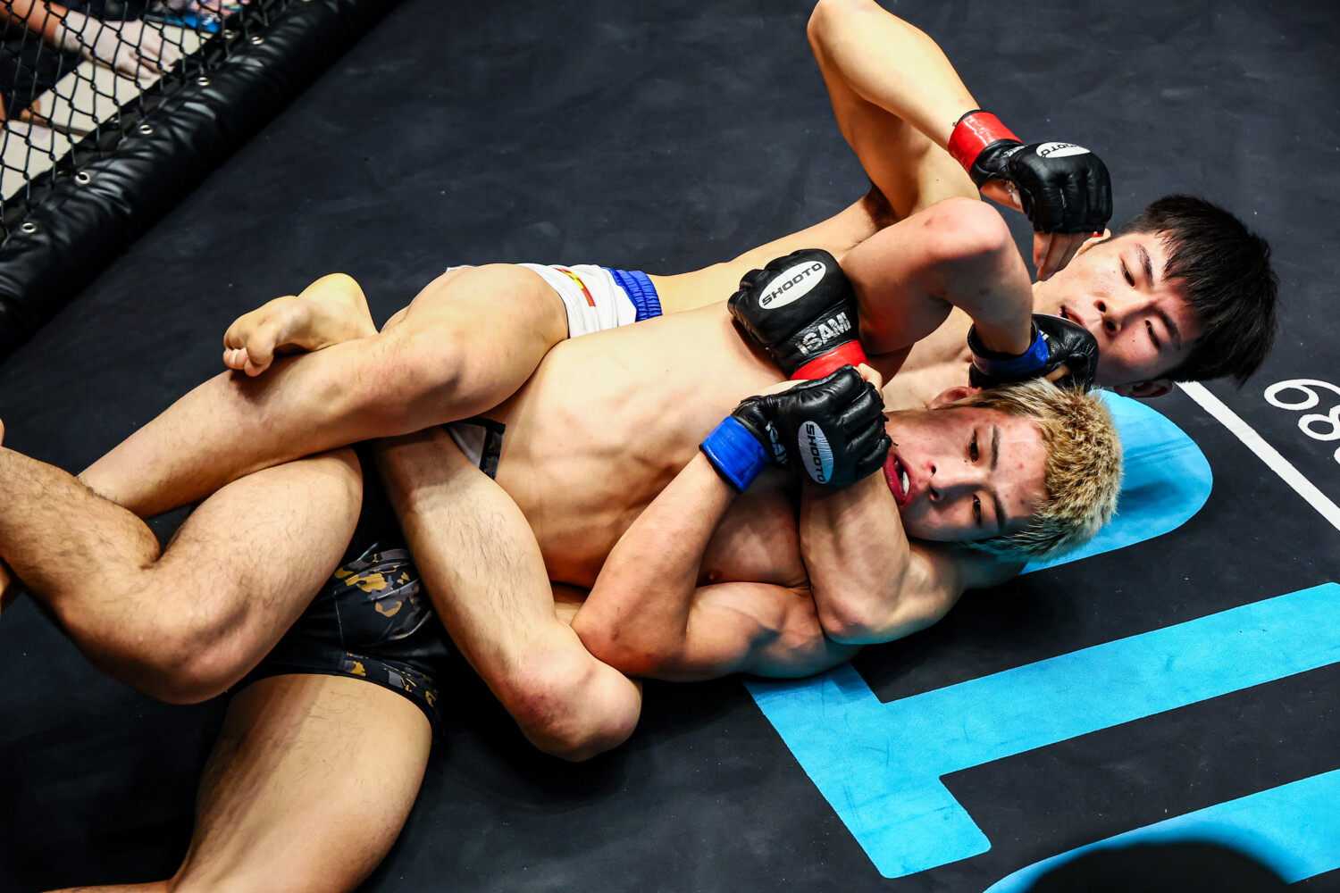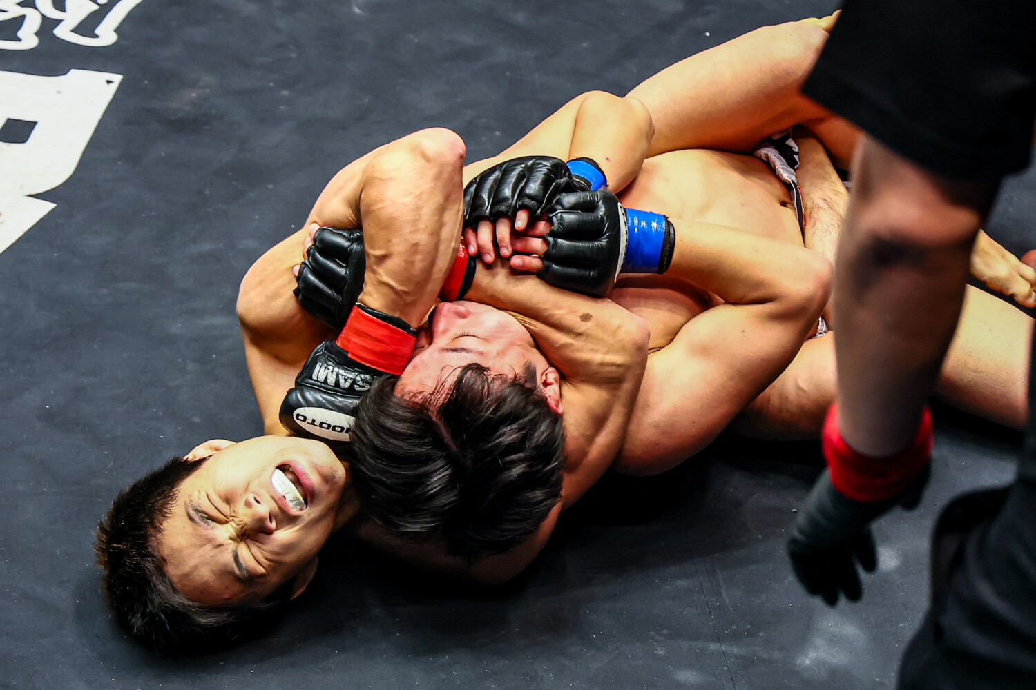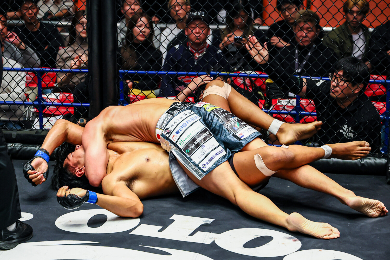 3R、亮我は開始すぐからタックルを仕掛け、中央付近でトップキープする。亮我は押さえつつ、時折体を浮かしてパウンドを当てる。とはいえ膠着気味になると、豊永レフェリーはアクションコールを繰り返し、上になってから1分半ほどでブレイクをかける。UFCよりも早く、DEEPに近いブレイクの早さになっている印象だ。スタンドの展開で、亮我が左フックを当てる。関口は両足タックルを仕掛け、切られると、脇を差してから膝蹴りを放つと、空振りして後ろにスリップしてしまい、亮我が上になる。結局この関口のミスが負けにつながることに。終盤、亮我は関口が背中を上げたタイミングで、パスガードを狙い、ハーフから足を抜いてそのままバックに回り込む。残り1分を切り、亮我は両足を関口の胴に入れてコントロールしつつパウンドを当てると、一瞬の隙を突いて裸絞めを極め、タップを奪った。