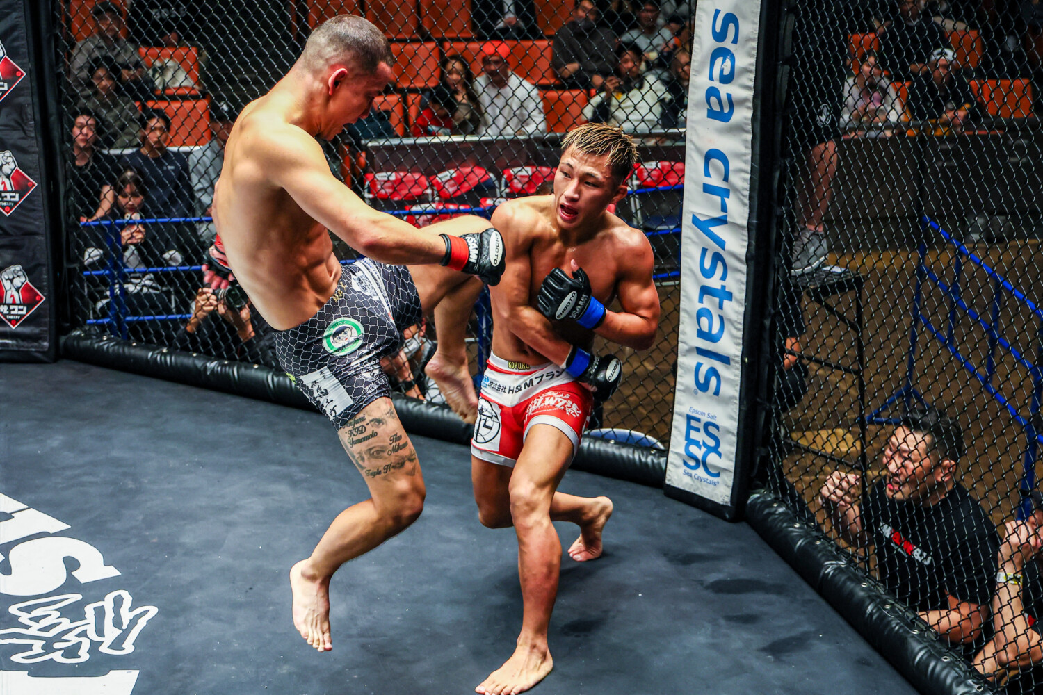 2R、亮我が関口を金網に押し込み、両脇を差した状態から倒して上から押さえる。だが中盤、関口は上を取り返すと、立ち際にパンチを連打して印象を作る。さらに関口は倒して上になると、立ち際にボディに膝を連打する。関口はスタンドの展開でバックスピンキックを2度当てる。だが終盤、亮我も右フックを当て、関口を少しひるませる。だが残り1分を切り、関口はタックルでテイクダウンに成功する。亮我は立って押し込むが、離れ際に関口は右バック肘を当て、好印象で終える。記者採点はテイクダウンとヒット数で上回る関口。ジャッジは割れ、2者が関口、1者が右フックを効かせた亮我につける。