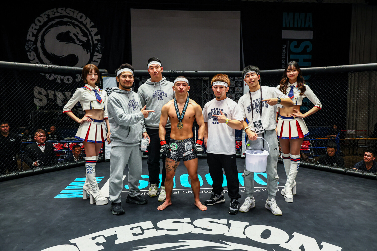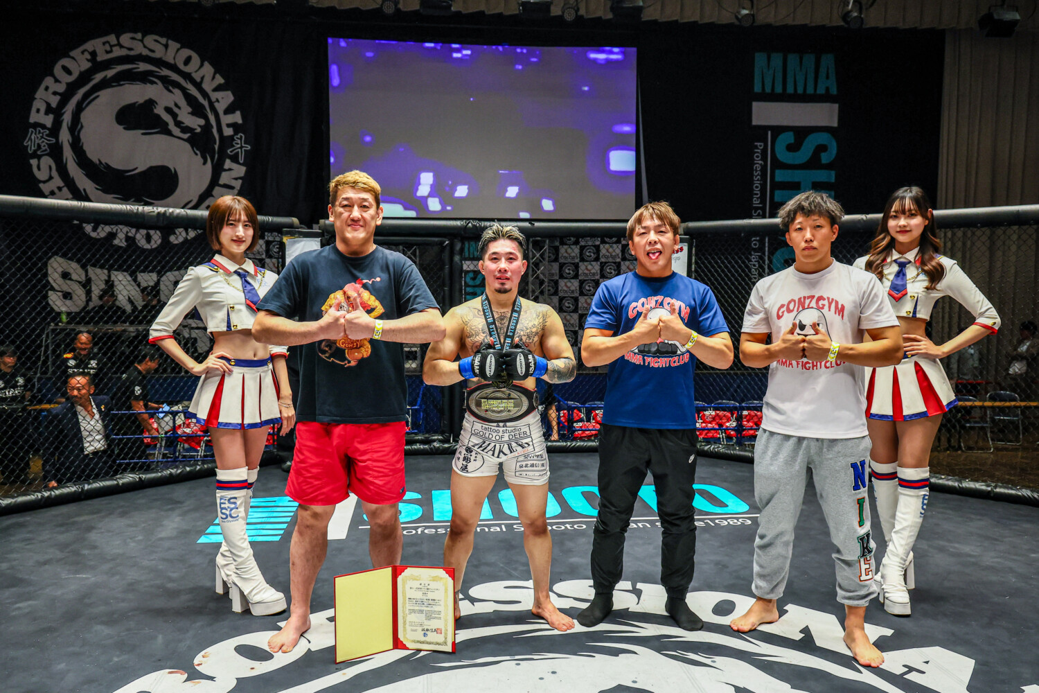 亮我は27歳。神戸出身で22年にプロデビューし、MMA 12戦9勝1敗2分。昨年11月、インフィニティリーグ2024フライ級最終戦で須藤晃大に2R判定2-0で惜敗し、プロ9戦目(修斗8戦目)で初黒星を喫したが、今年に入ってからは6月までに3試合こなし、1月に大竹陽に1R KO勝ち、4月に黒石大資に判定勝ち、6月に高岡宏気に高岡の地元香川で判定勝ちし、着々と順位を上げ、今回の王座初挑戦につなげた。