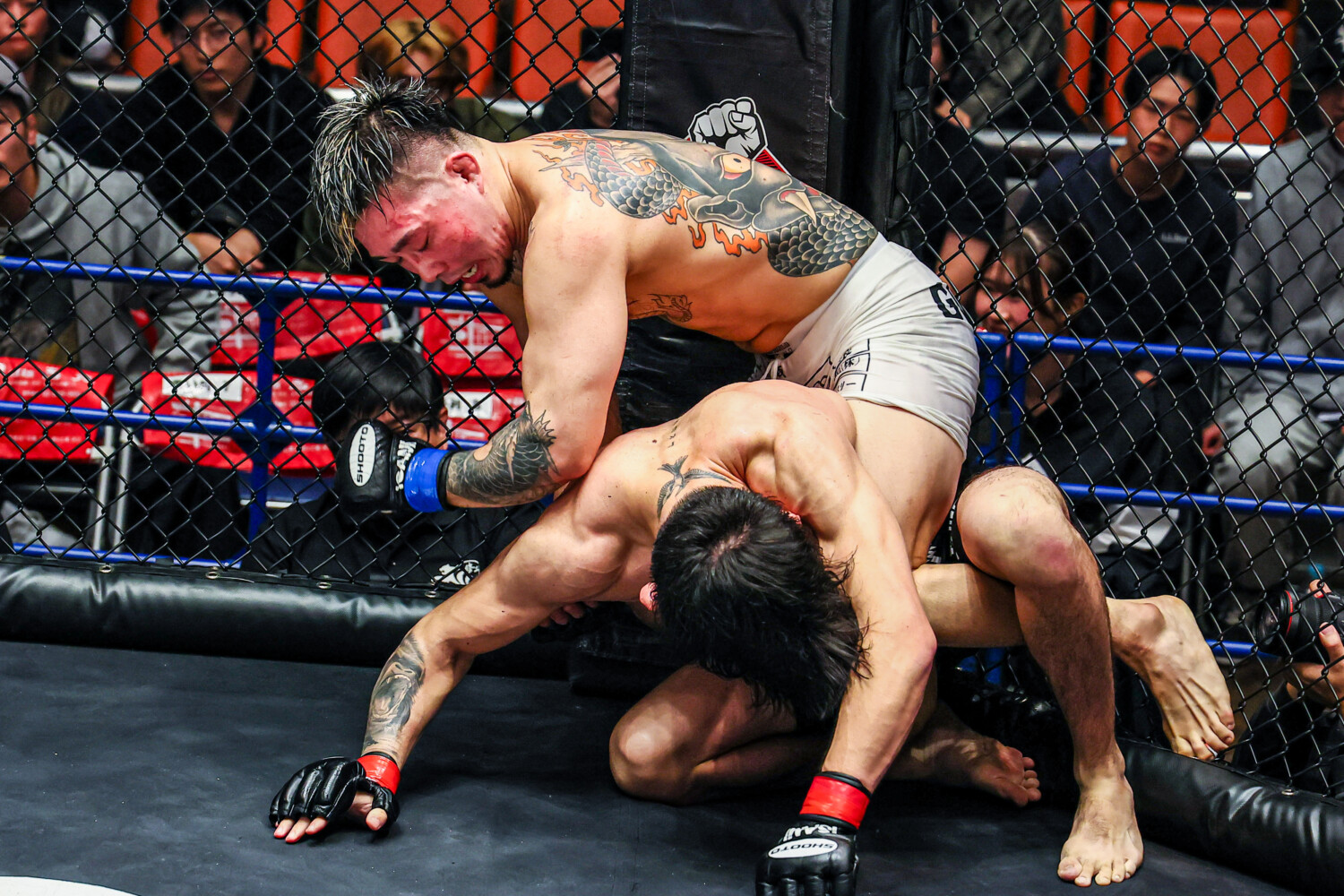 1R、開始すぐから関口はタックルを仕掛け、亮我は金網を背に膝立ちになる。関口はバックを狙うが、亮我は振りほどいて逆に上になって押さえることに成功する。亮我は押さえるので手一杯でパウンドをほとんど打てないが、関口が立てない状態が続くのは確かで印象が悪いまま終わる。記者採点もジャッジ3者も亮我。
