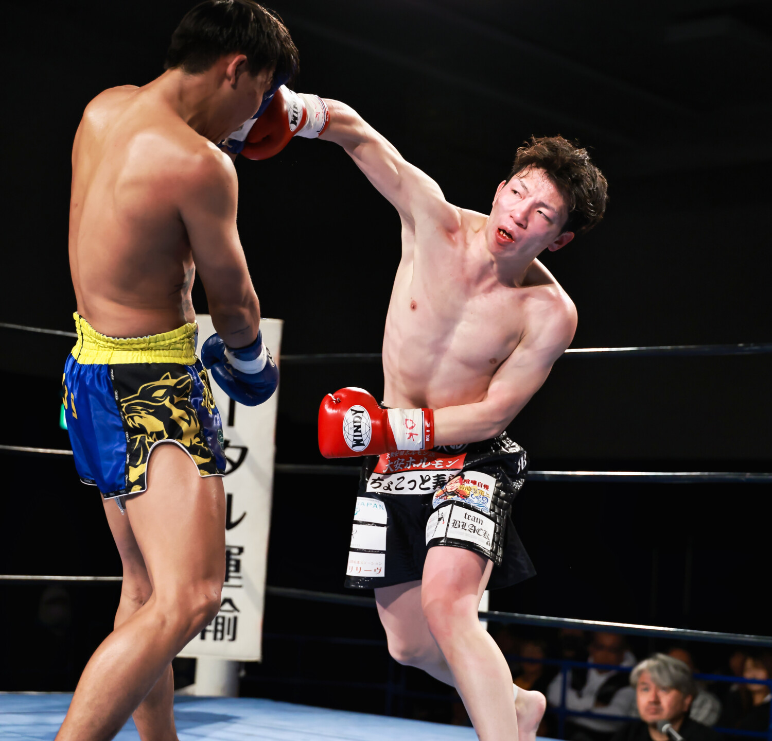 2ラウンドも同じような展開が続くがペットパークマイの右ローに合わせて愛翔もストレートをカウンターでヒットさせる。