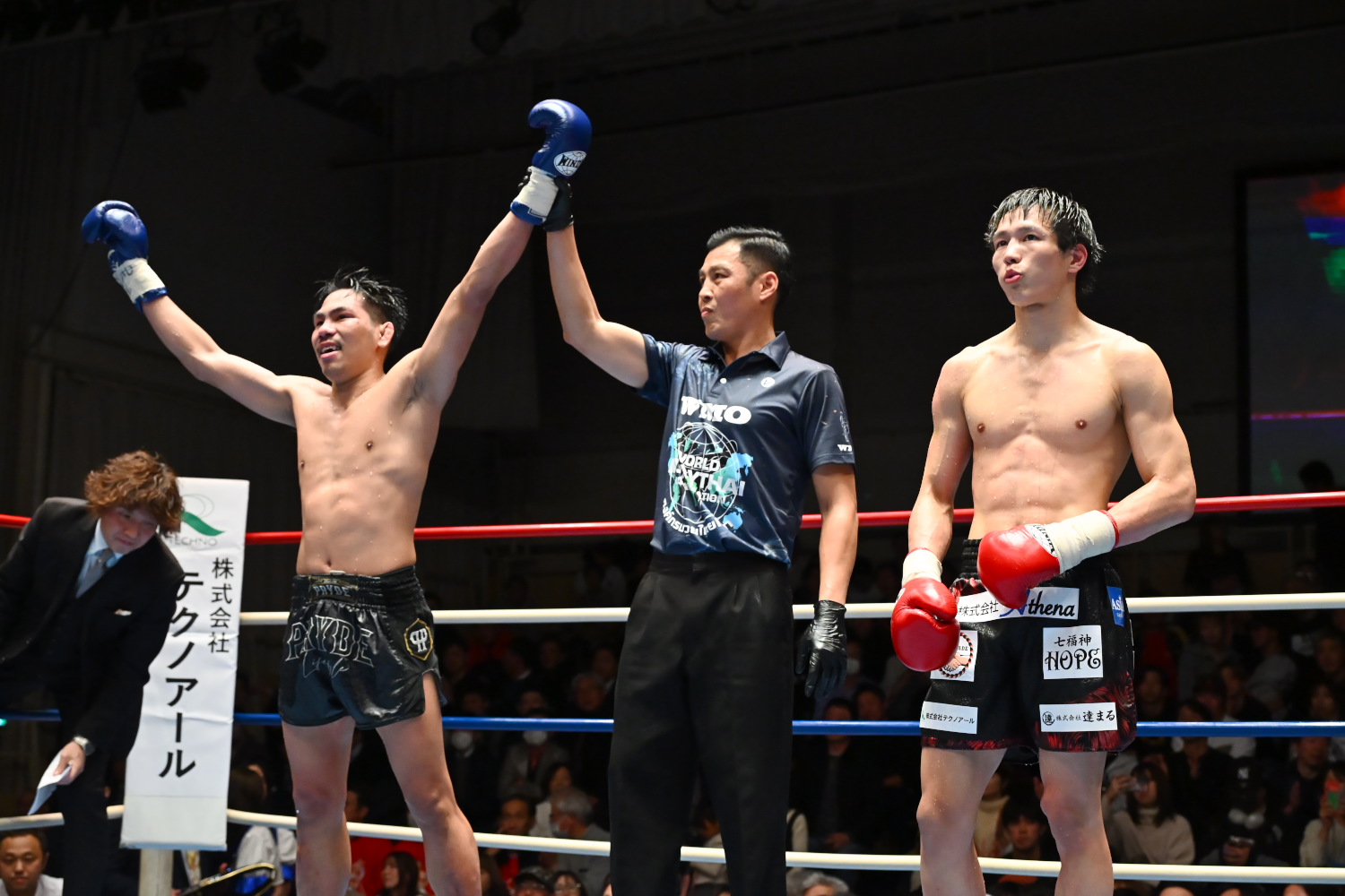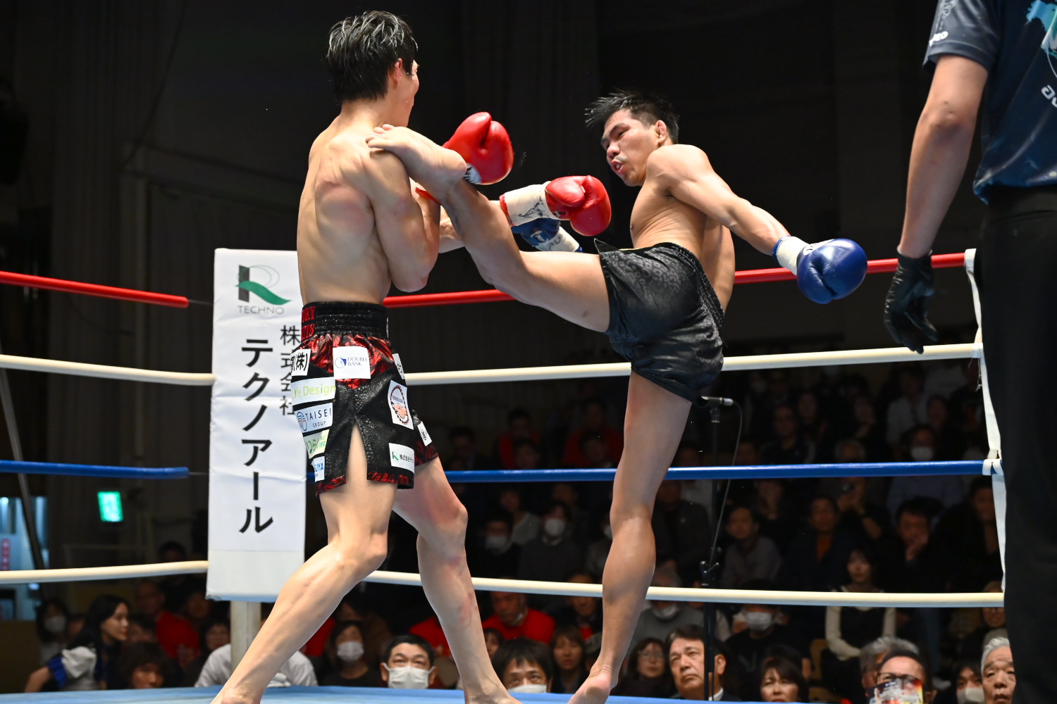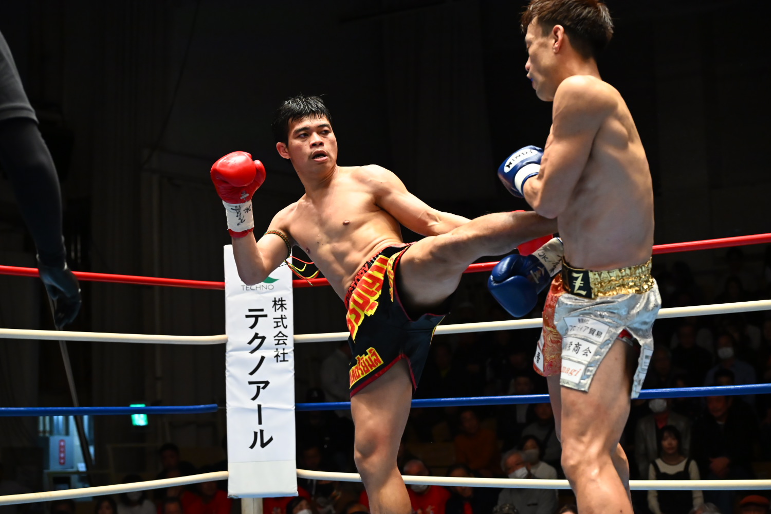 1R、瀧澤がオーソドックス、チャイトーンがサウスポーで構え、離れた距離からミドル、ロー主体の攻防が続く。両者まだ探り合いで攻撃が少ない。終盤、チャイトーンが前に出てパンチを振るう場面が少し目立つように。記者採点はイーブン。ジャッジ3者ともイーブン。