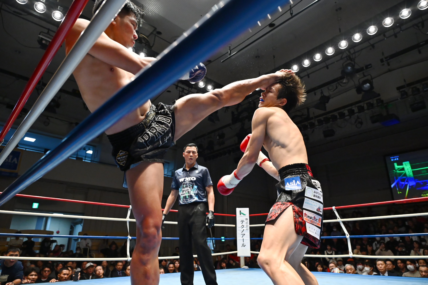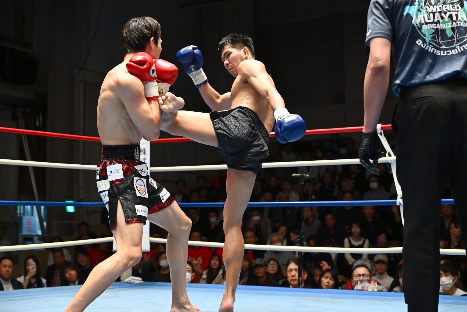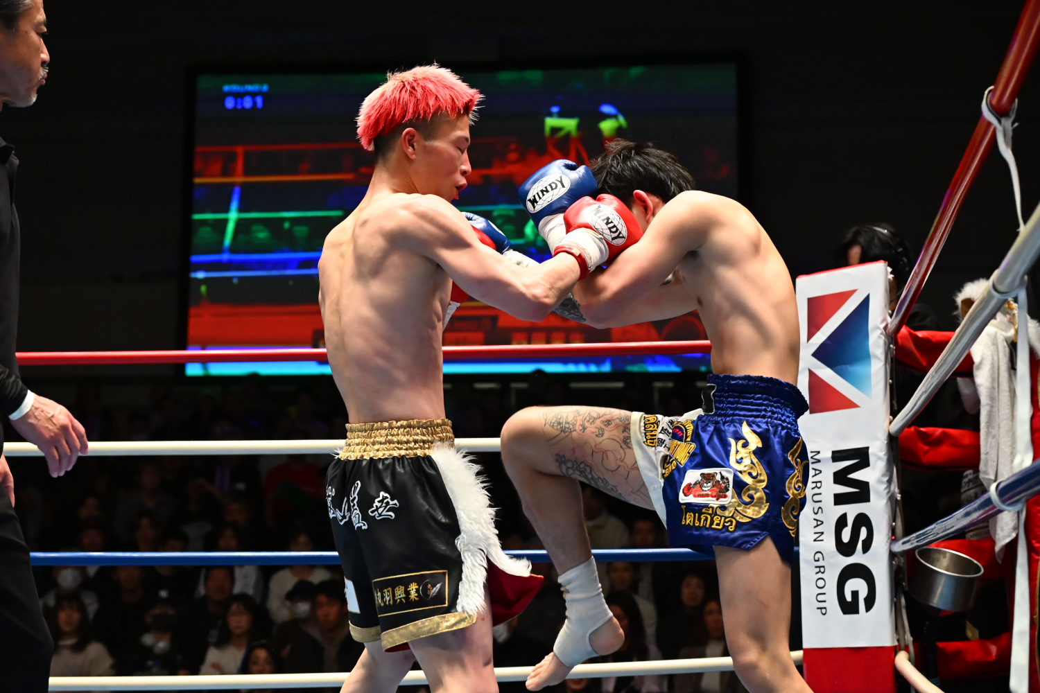 1R、瀧澤がオーソドックス、チャイトーンがサウスポーで構え、離れた距離からミドル、ロー主体の攻防が続く。両者まだ探り合いで攻撃が少ない。終盤、チャイトーンが前に出てパンチを振るう場面が少し目立つように。記者採点はイーブン。ジャッジ3者ともイーブン。