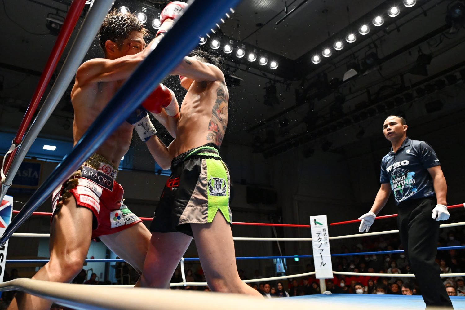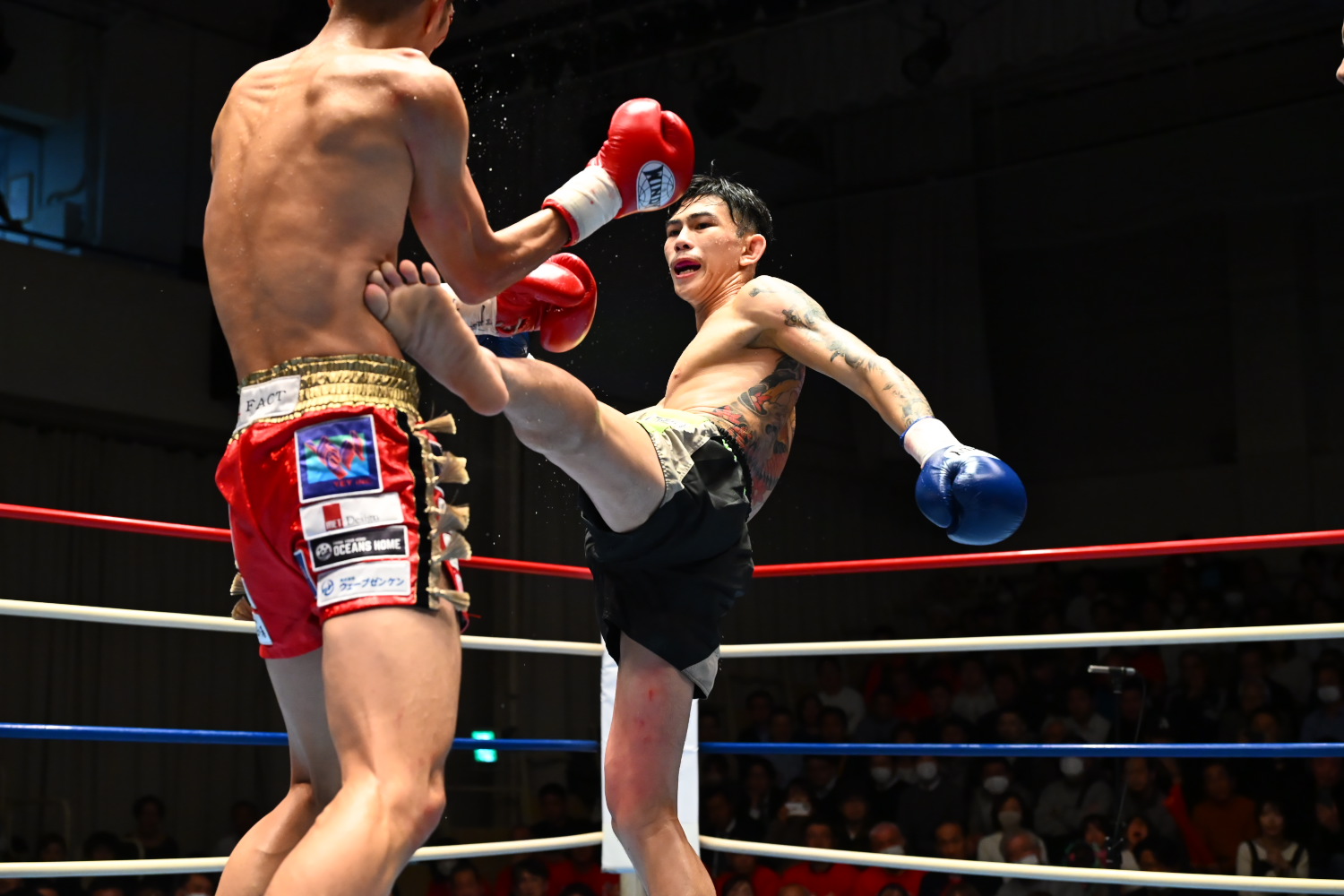 2R、チャイトーンがじわじわ圧力をかけると、飛び込んでの左肘を当て、瀧澤は早くも右まぶたを切られて出血する。瀧澤も肘の応酬で場内を沸かせるが、切り返すことはできない。チャイトーンは左ミドルも当て、トータルの攻撃数でも上回る。記者採点もジャッジ3者もチャイトーン。