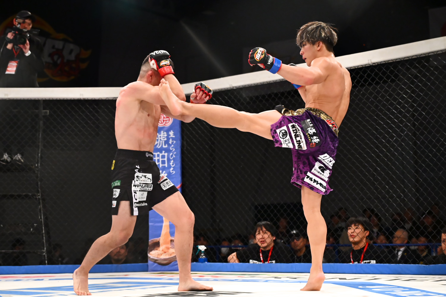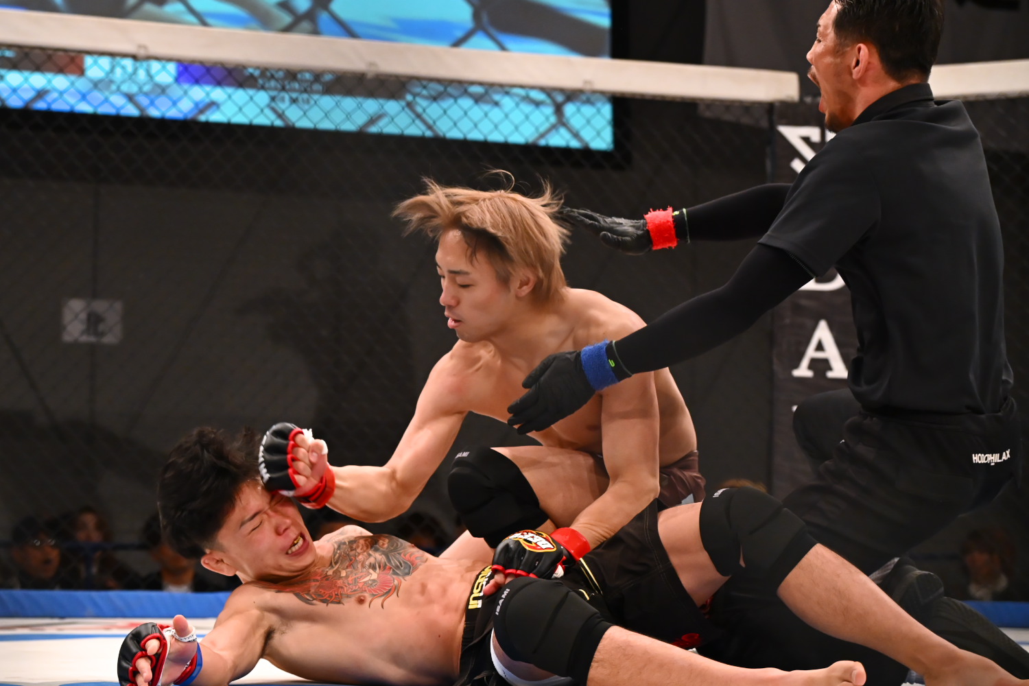 1R、力也がサウスポーで構えてプレッシャーをかけ、左ミドル、ストレートを当て、中盤、左ストレートをこめかみにクリーンヒットしてひるませる。力也がパウンドで追い詰めると、安谷屋は下からアームロックを狙うが、力也は抱え上げて頭からマットに叩きつけると、力が抜けた安谷屋に力也がパウンドをまとめたところで、レフェリーがストップした。