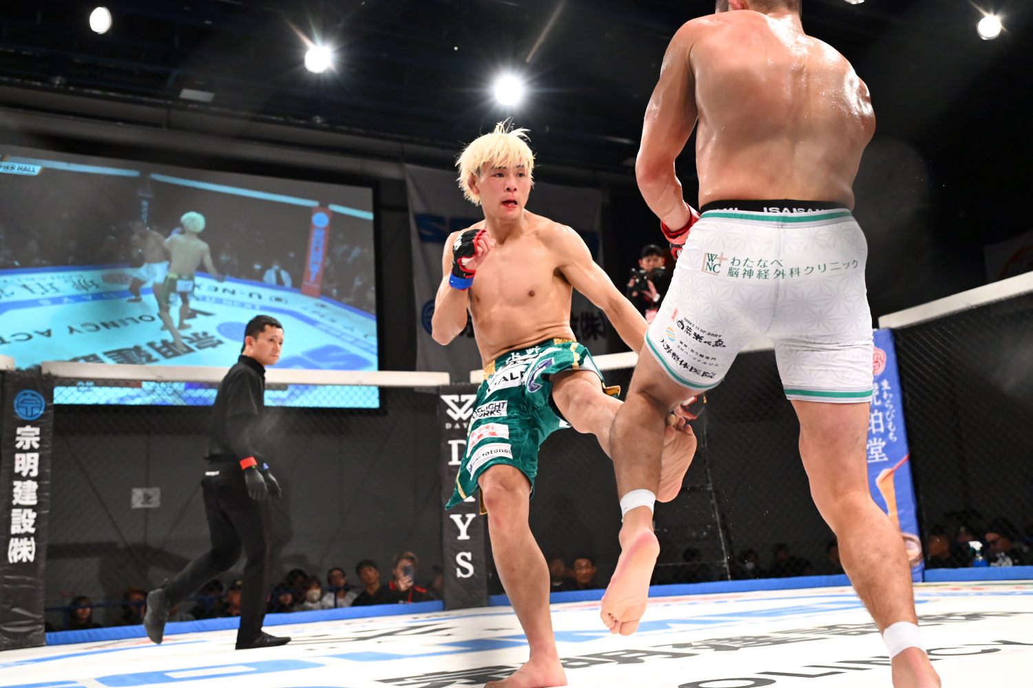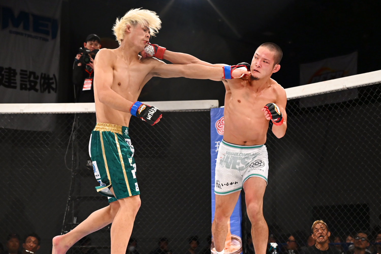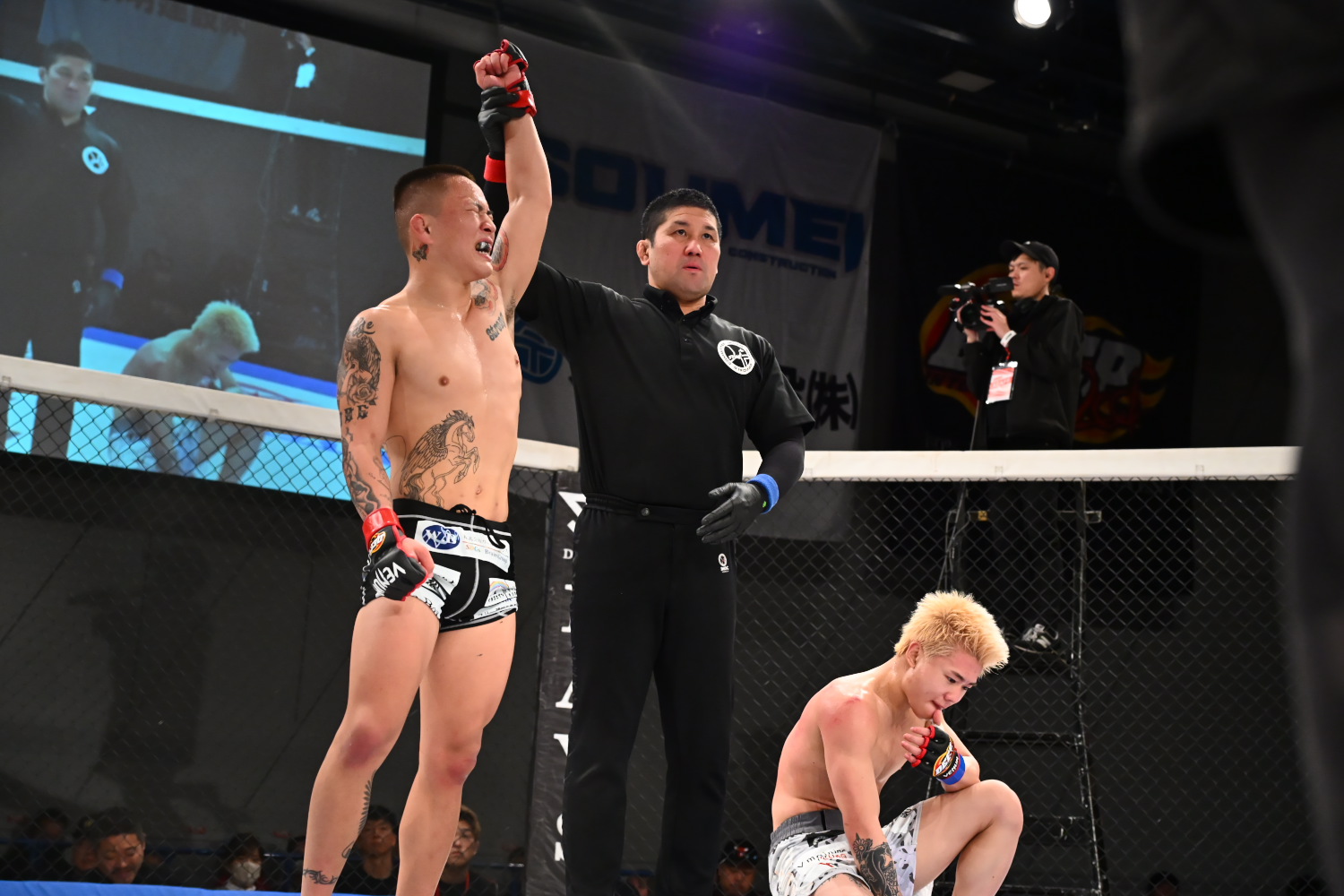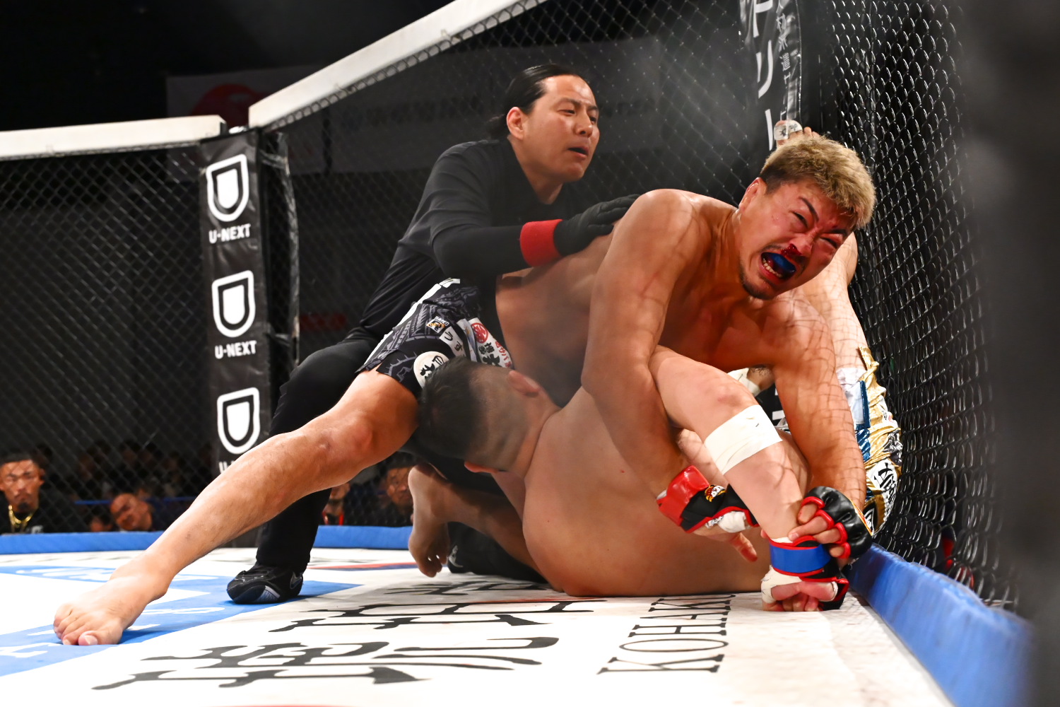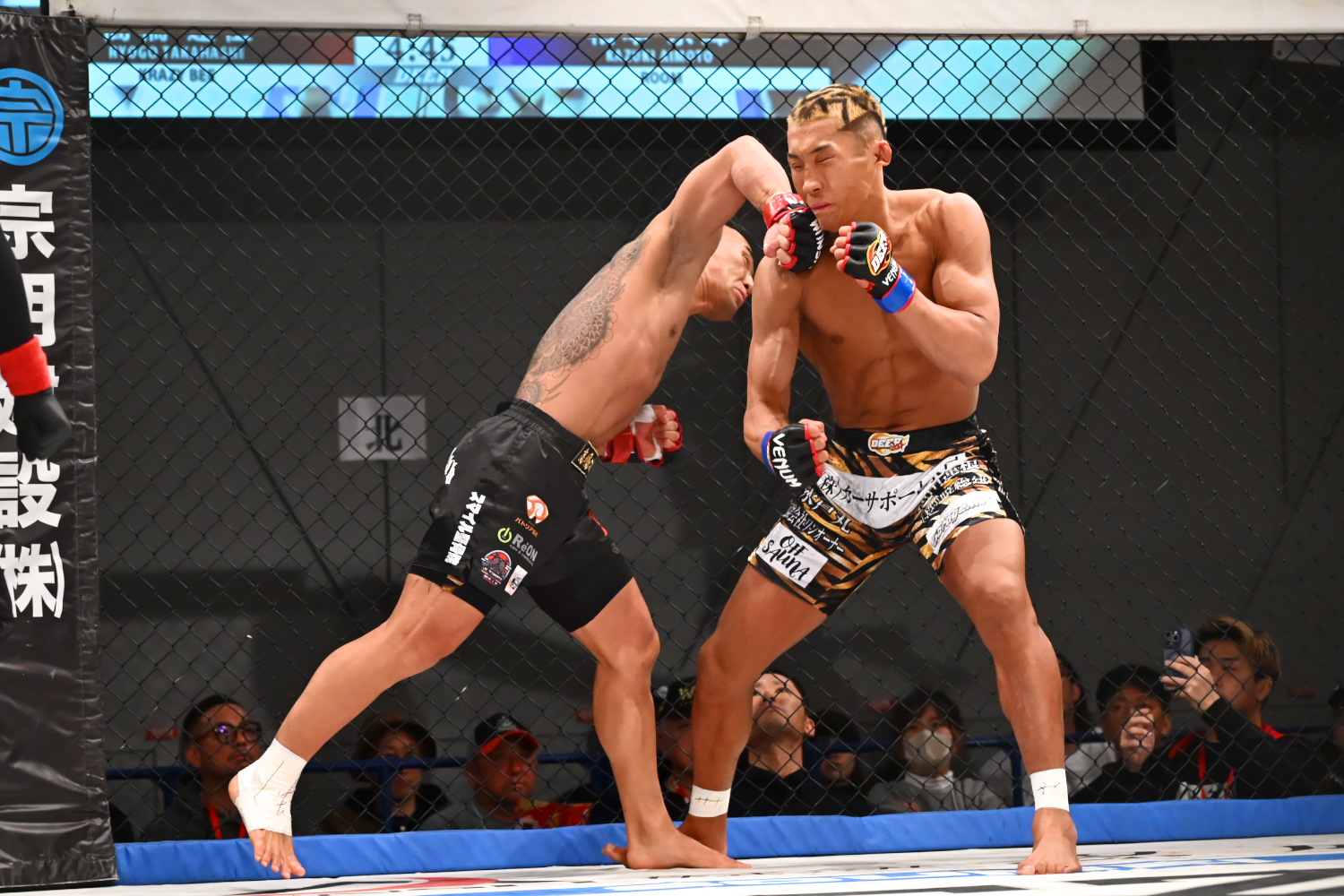 だが相本は変わらず前に出て、左インローを執拗に当てる。すると中盤過ぎ、相本の右ストレートが当たり出すと、高橋を金網際に詰め、右ストレートをクリーンヒットする。ダウンした高橋に、相本がパウンドをまとめたところで、レフェリーがストップした。高橋のセコンドからもストップを要請するバトンがケージに同時に投げ入れられていた。