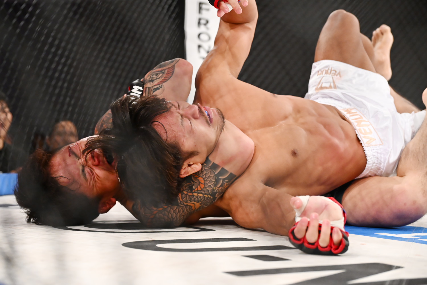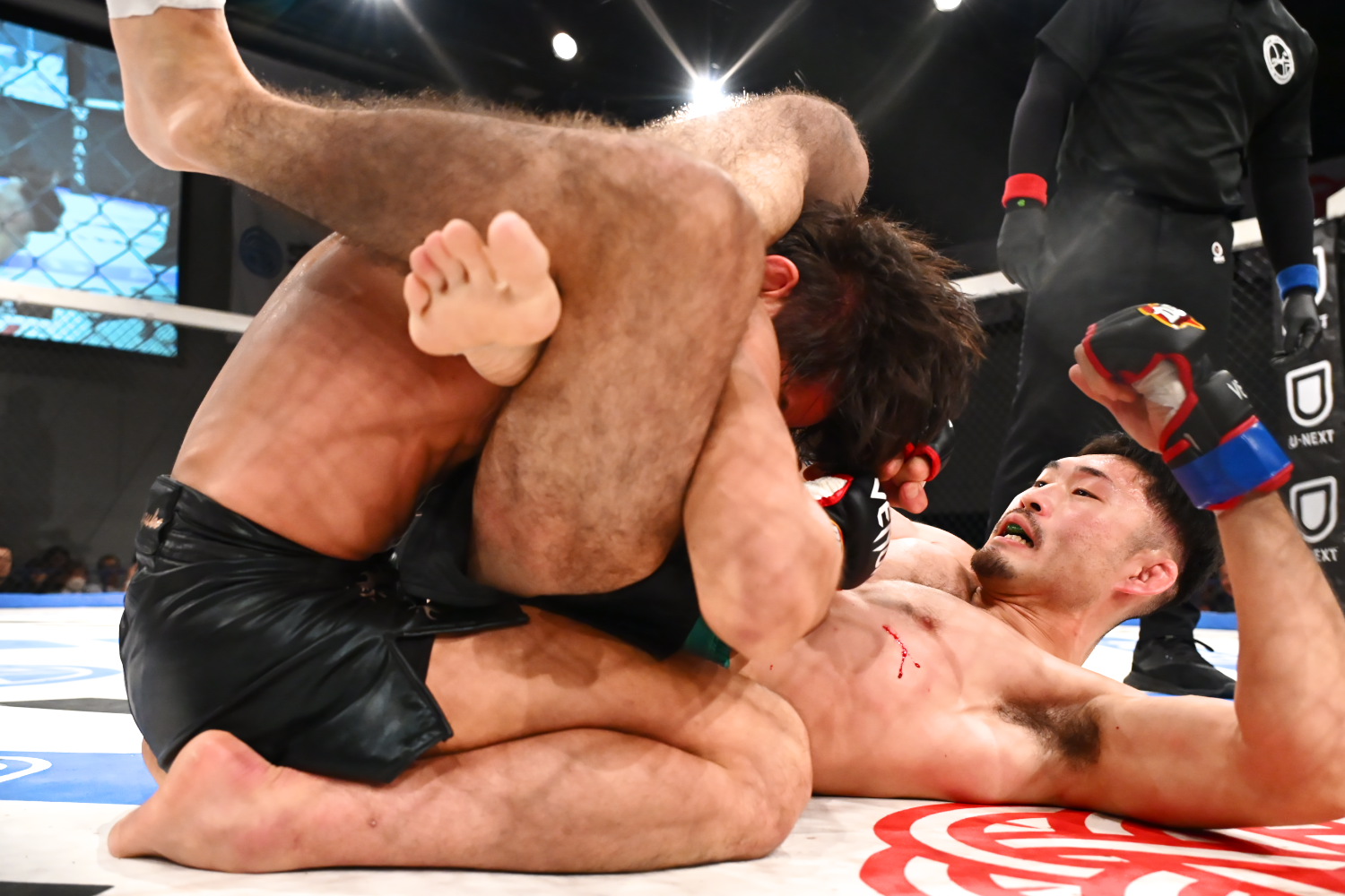 試合は武田のワンサイドゲームに。1R、武田は開始すぐから奥山を押し込み、倒すと金網際で押さえる。武田は右のパウンドを随所で連打する。武田は一旦立って踏みつけを当てると、体を背けた奥山のバックに周り、金網際でバックマウントを奪う。武田は裸絞めをガッチリと極めタップを奪った。