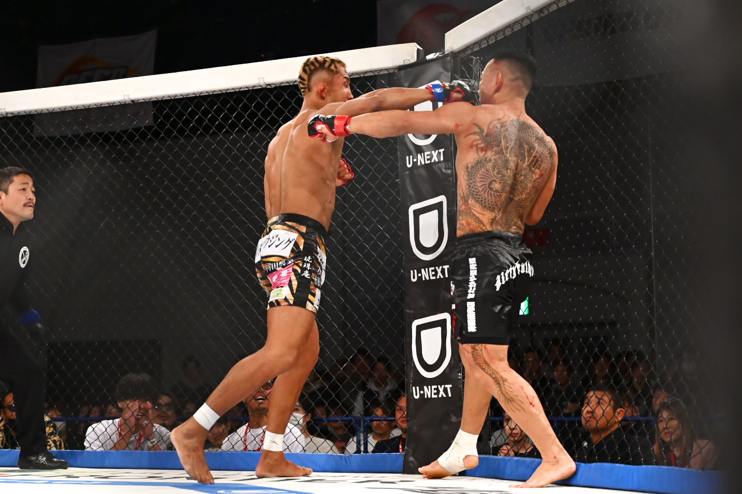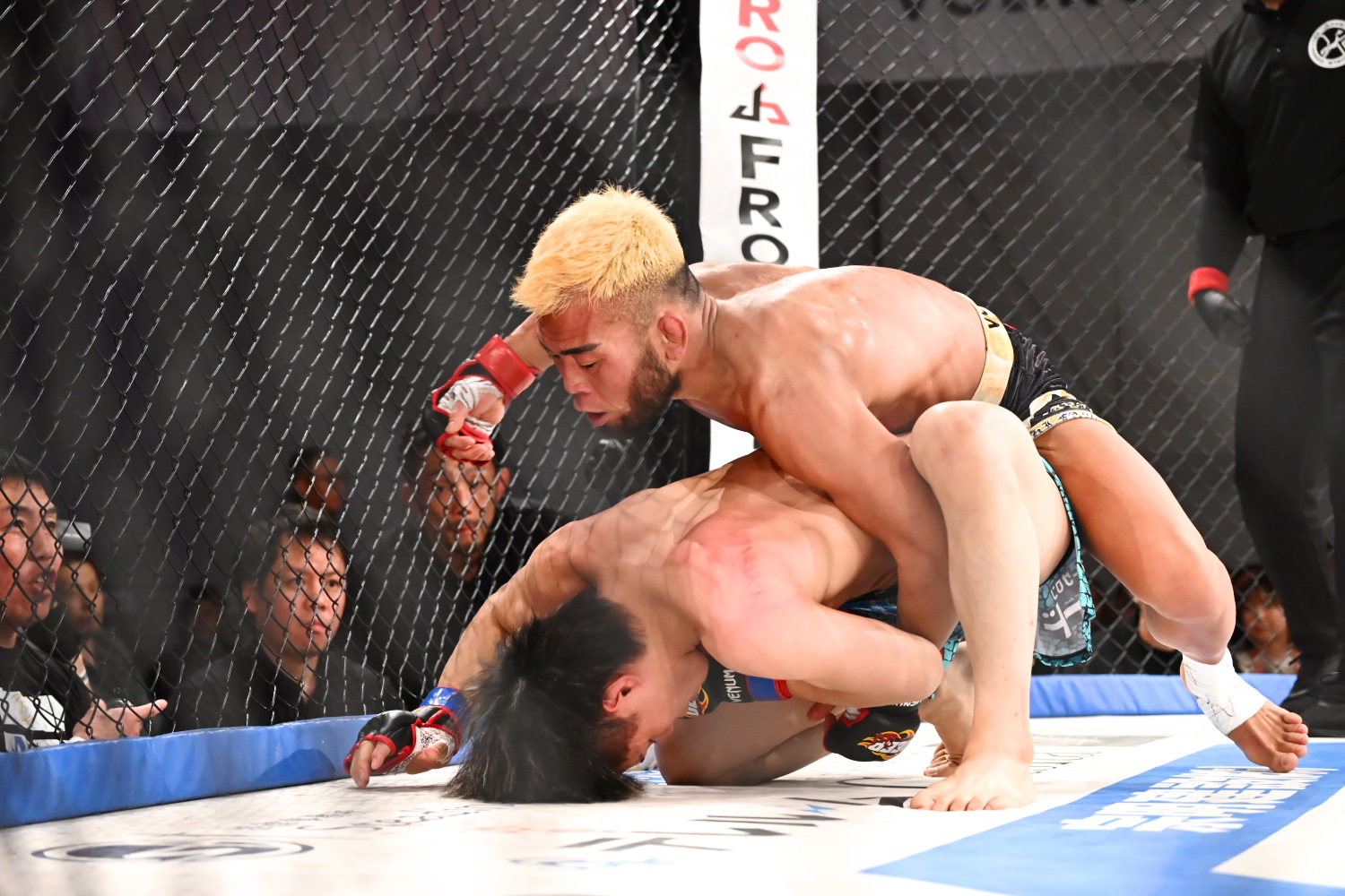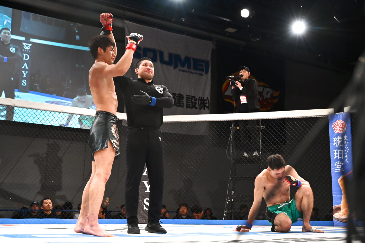 高橋は今年4月のDEEPフューチャーキングトーナメント・フェザー級優勝者。9月のプロデビュー戦で勝利し2戦目だ。1R、開始すぐから高橋が左フックを当て、中盤以降もグラウンドでコントロールし優位に進める。2Rも高橋がグラウンドでサイドから押さえるなど、主導権を維持し判定勝ちした。