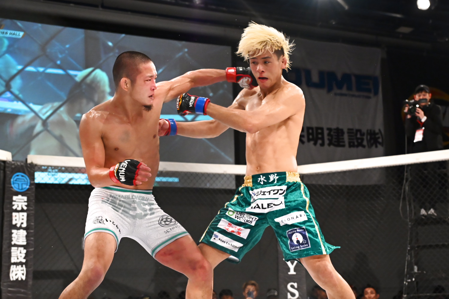 水野は22歳。所属はフリーだが主に大塚隆史代表のT-GRIP TOKYOで練習している。23年にMMAデビューし8戦全勝。NEXUSで3勝後、昨年9月と11月のDEEPで勝利。今年のDEEPフェザー級GPのメンバーには最後に選ばれたが、3月の一回戦で元同級王者の芦田崇宏に1R TKO勝ちすると、準決勝では海飛に判定勝ちし、8月の決勝では高橋遼伍に判定勝ちし優勝した。