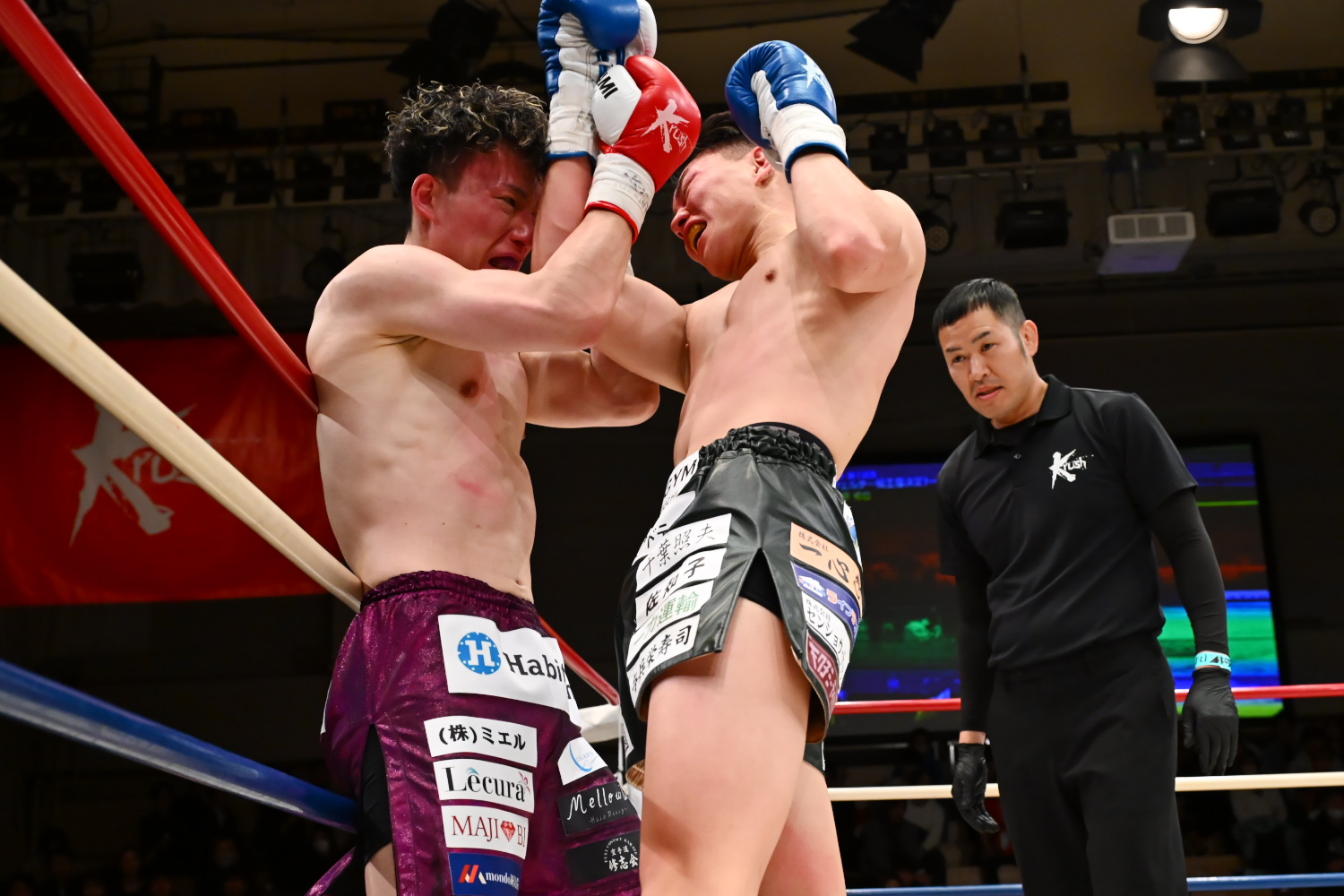 2R、安尾は序盤こそ左ボディを当てていたが、上遠野はブロックして耐えると、中盤、伸びのある左ボディをクリーンヒット。安尾の動きが少し止まると、上遠野はさらに左ミドルを強打して下がらせ、右アッパー、左ストレートにもつなげて挽回する。その後は安尾も持ち直し、左フックやボディを返すが、上遠野はひるまず、好印象を作らせない。記者採点は上遠野。