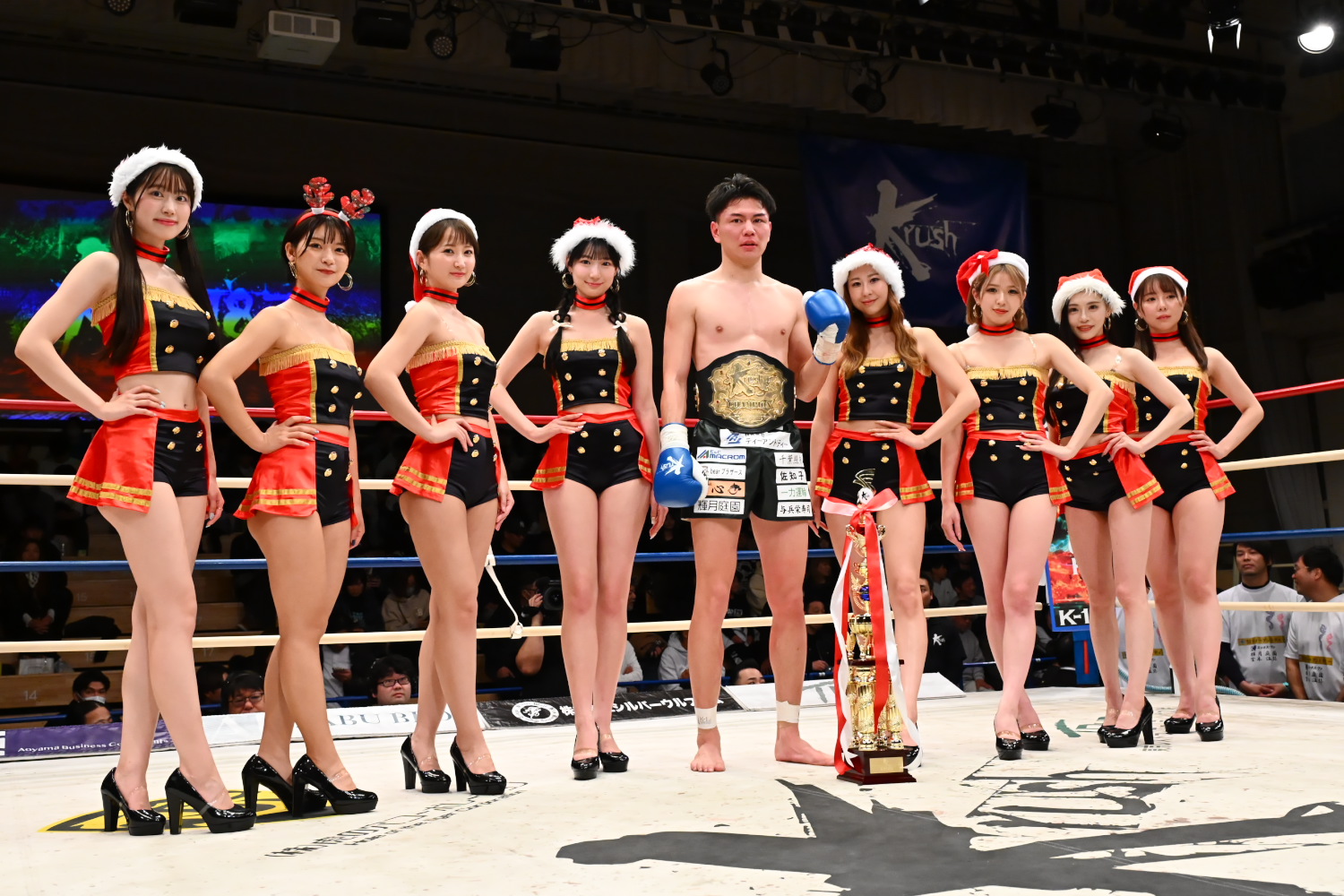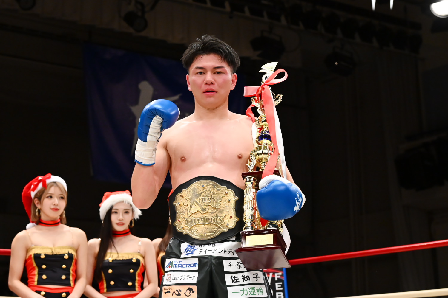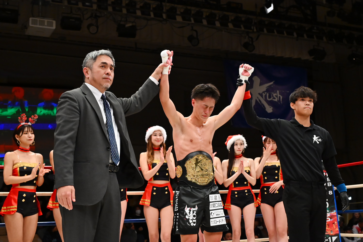 プロ7戦全勝でベルトを巻いた上遠野は「いつもサポートしてくれたお父さんお母さんありがとうございました。ちっちゃい頃から愛を持って厳しく育ってくれた古川会長、ありがとうございます。応援に来てくれたみんな本当にありがとうございました。これから僕もチャンピオンとしてKrushを盛り上げていけるようにもっと頑張るのでこれからも応援よろしくお願いします」と話した。