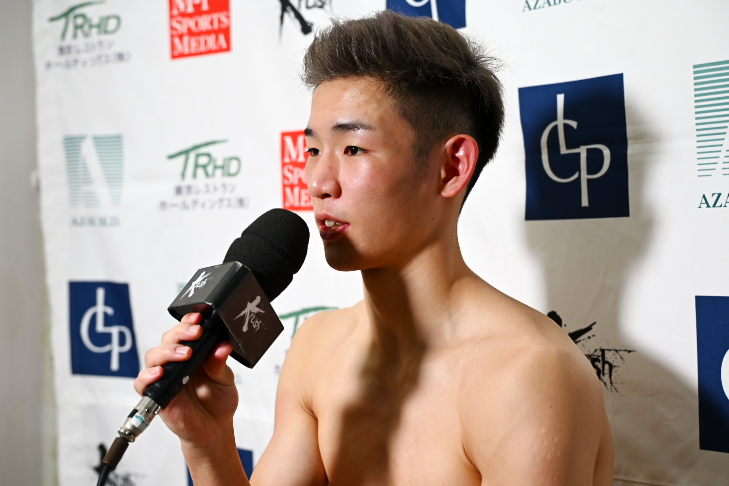 バックステージでのインタビューで上遠野は、1Rのダウンについて「ちょっとバランス崩しちゃっただけで、あれは当たってはないです」と振り返り、安尾の左ボディについては「いつも練習で先輩たちにやられてるんで。まあ大丈夫でしょうと」と話し、問題にしなかった様子。最後のKOの右フックに関しては「セコンドが指示出したので、それを僕がやってた感じで、あとは流れで出ましたね」と話した。どんなチャンピオンになりたい?という質問には「倒せる、盛り上げられる、強いチャンピオンになりたいです」と力強く答えた。