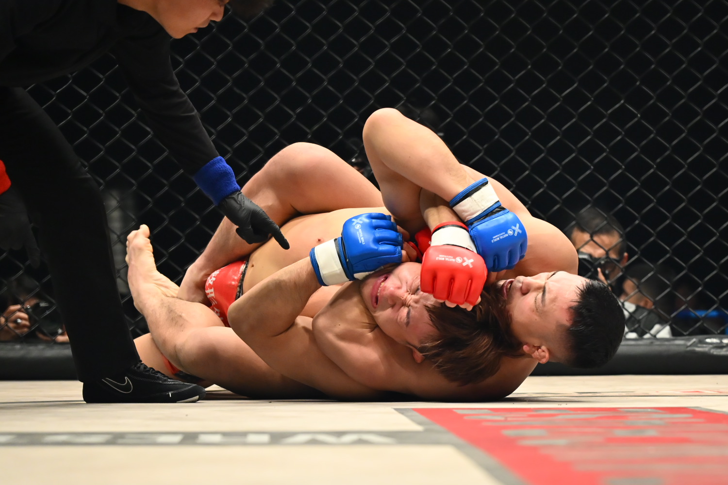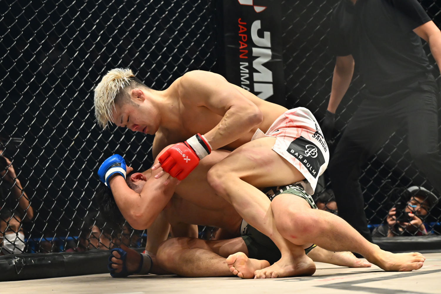 試合は岸田の圧勝に。1R、浜本が右ストレートを空振りすると、岸田は片足タックルを仕掛けて倒し、すぐさまバックマウントを奪う。岸田はサイドに移るが、肘と鉄槌で追い詰めてから、腕十字を極めタップを奪った。マイクを持った岸田は「来年ベルト狙うんでこれからも応援お願いします」とアピールした。