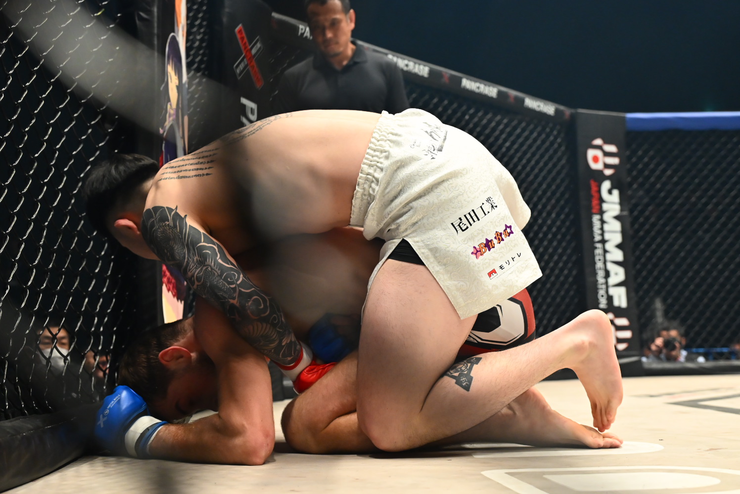 2Rも菅が足を掛けて倒し、今度はそのままサイドポジションを取り、鉄槌を当てる。中盤以降、菅はハーフ、トップと移るが、押さえ続け、最後は鉄槌をまとめ、好印象で終える。