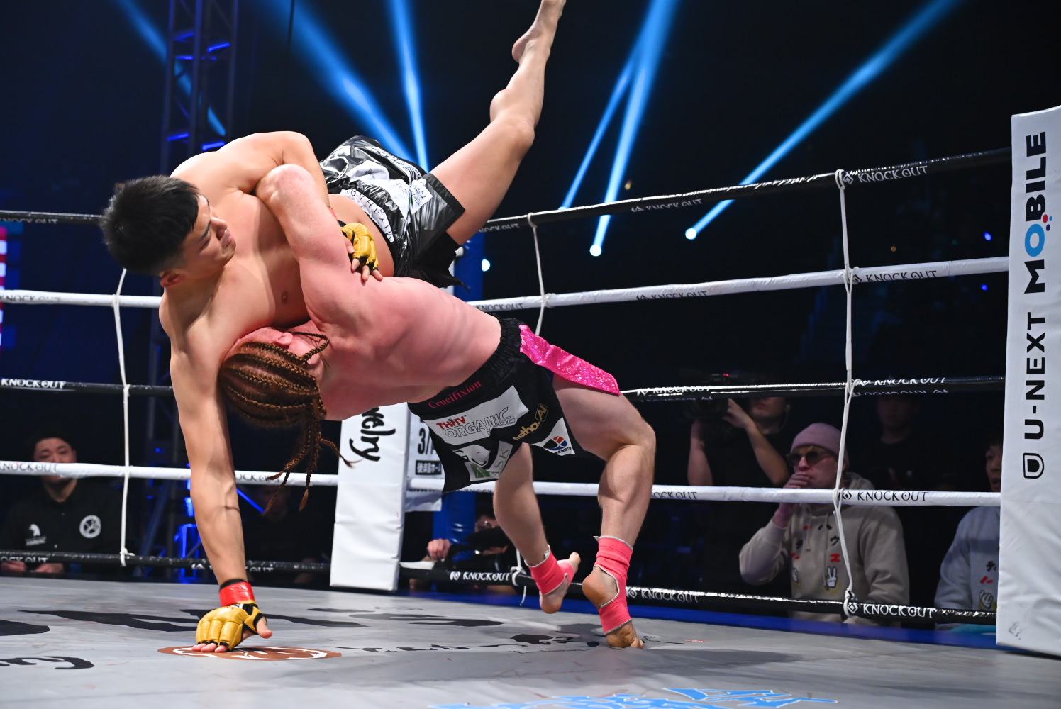 1R、大雅がサウスポーで構え、左インローを当てつつ、左ストレートもヒットする。両者ともキック・ムエタイ同様、重心が高めの構えで、タックルは意識していない様子だ。プンルアンも大雅の蹴り足をすくって倒すと、すぐさまサッカーボールキックを当て、見せ場を作るが、大雅はすぐ立つと、変わらず左ミドル、ストレートをヒットする。終盤には大雅が左ストレートを効かせ、左ストレートでダウンを奪うと、プンルアンのダメージが大きく、大雅は追撃せず、すぐさまレフェリーがストップした。