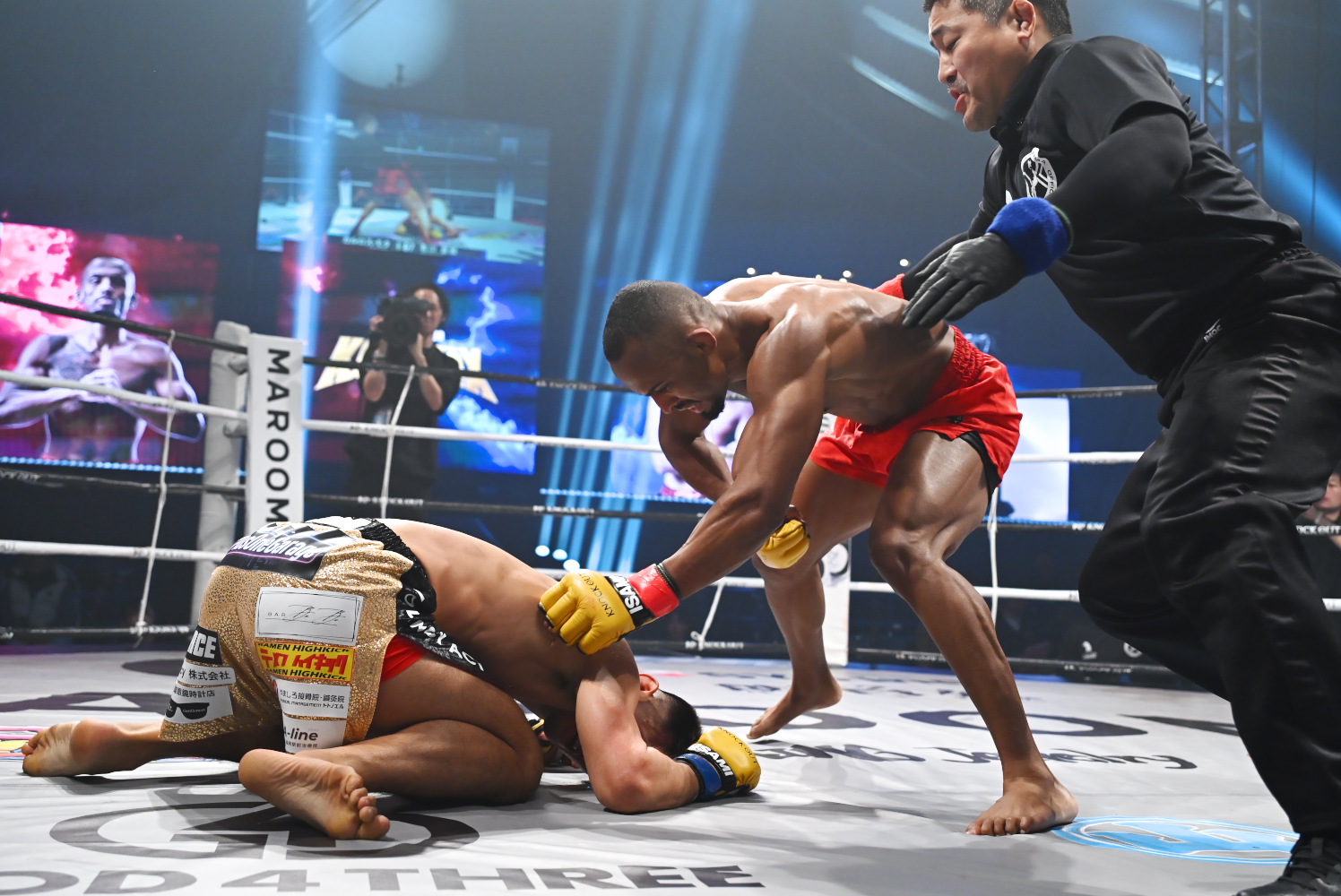2R、有川も左ミドル、右ローを的確に当てていたが、一発の破壊力で勝るモタが左ストレートをクリーンヒットしてダウンを奪う。有川は踏みつけで襲い掛かり、立たれてもパンチと膝で追い詰める。最後は左ハイと膝を連続で当てて倒し、うずくまった有川にパウンドを連打したところで、植松レフェリーがストップした。